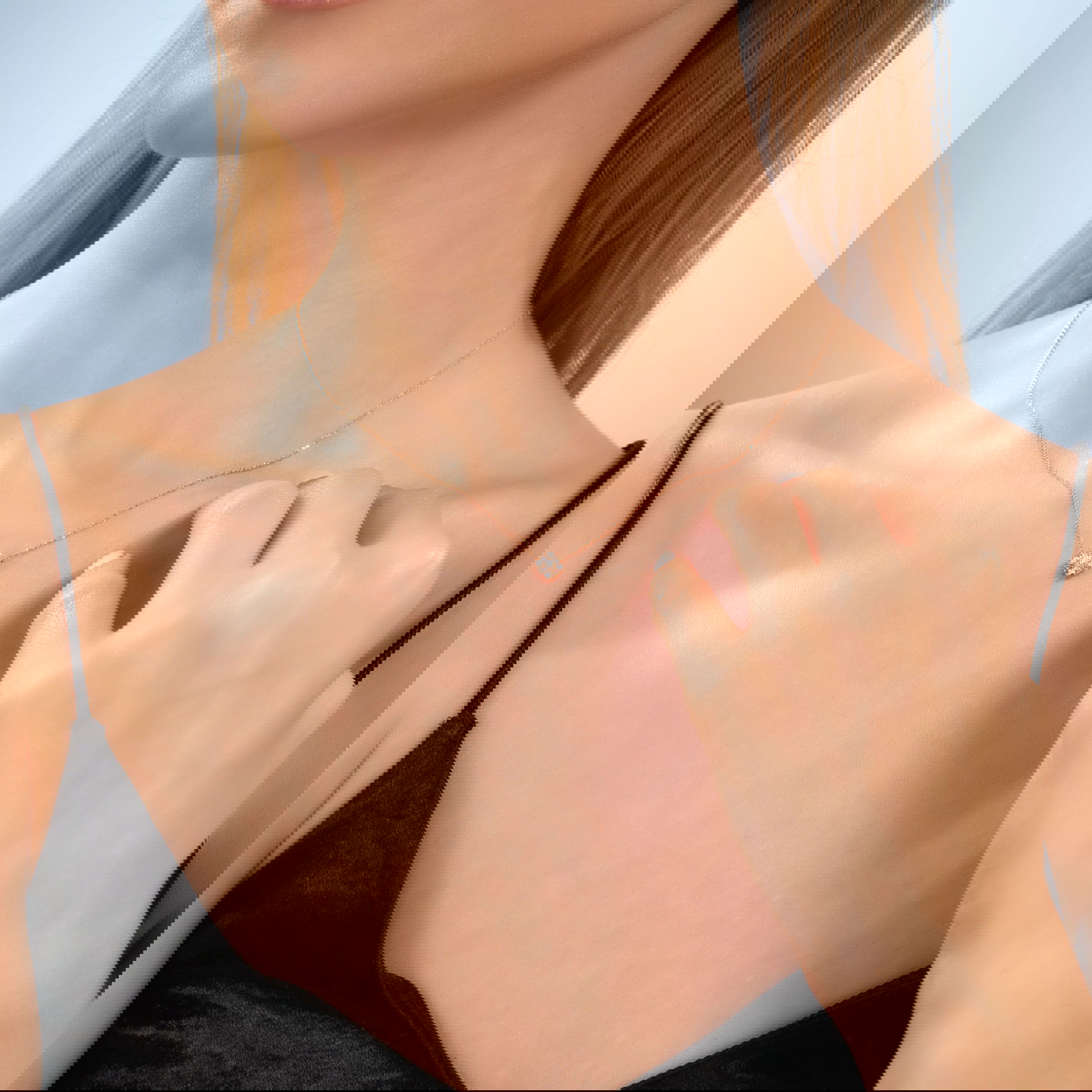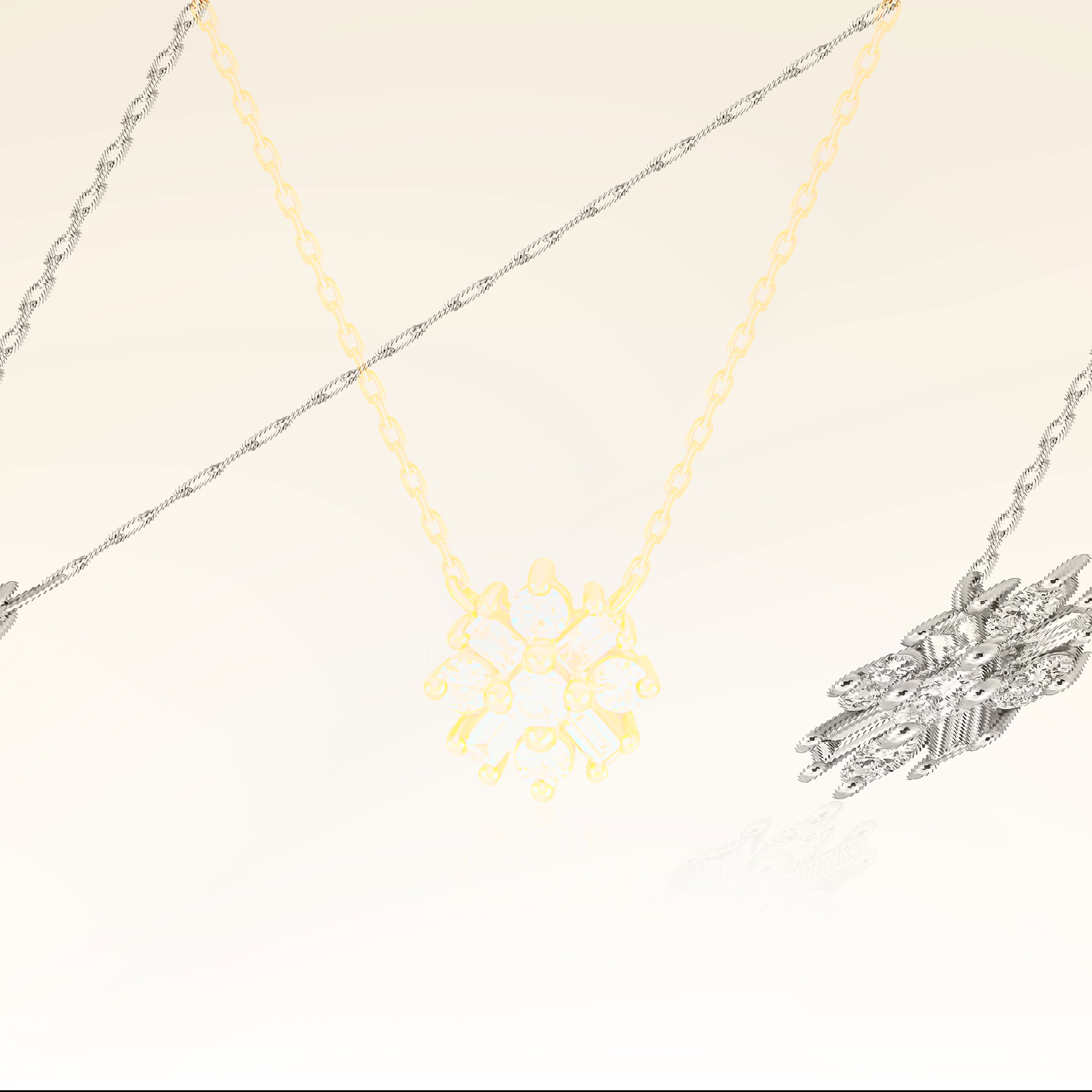 Üründe G renk SI berraklığında baget ve yuvarlak kesim pırlanta taşlar kullanılmaktadır. Parlaklığı ve netliğiyle dikkat çeken bu taşlar, zarif bir görünüm sunar. Pırlanta kolye, 42,5 cm standart zincir uzunluğu ile üretilmiştir.