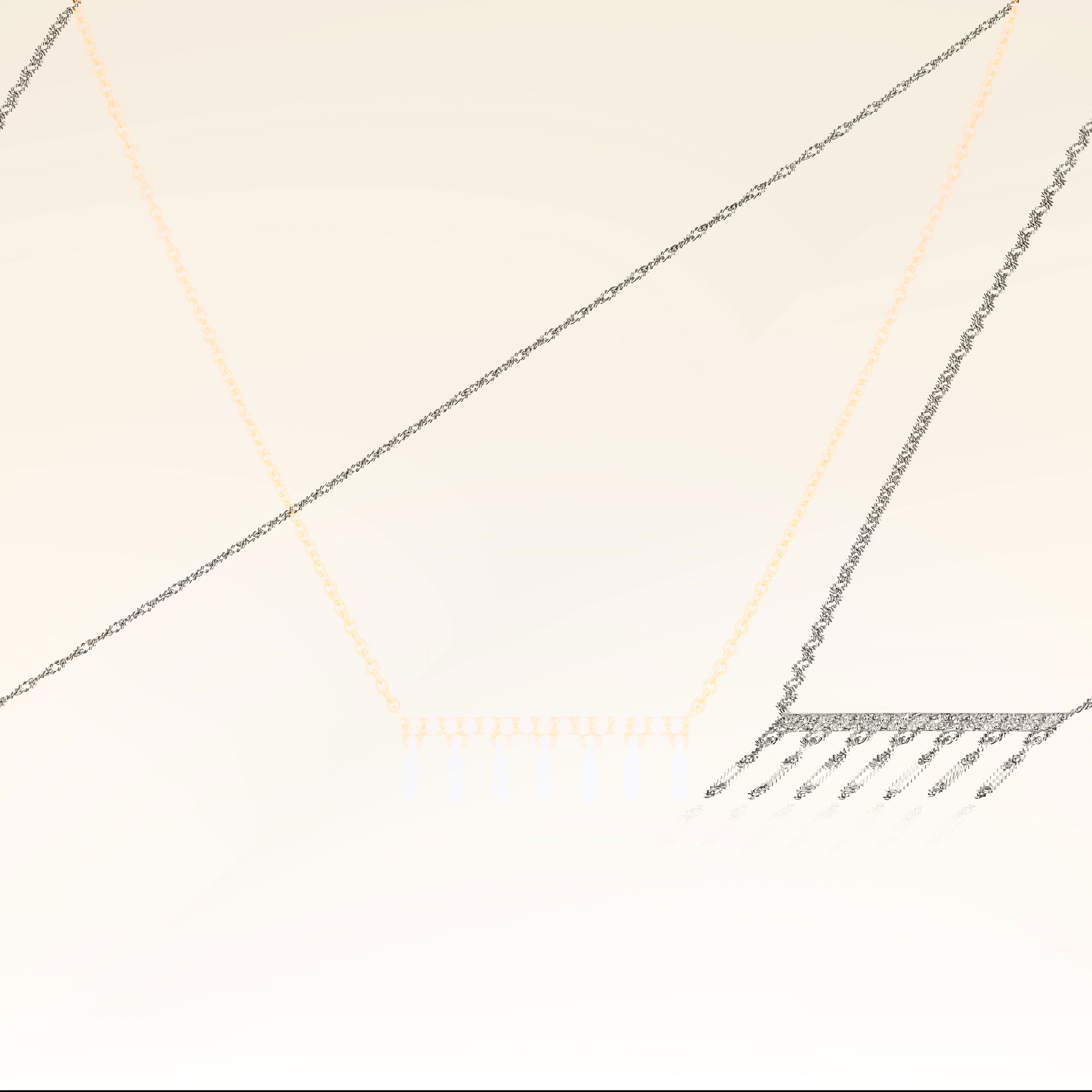 Üründe G renk SI berraklığında baget ve yuvarlak kesim pırlanta taşlar kullanılmaktadır. Parlaklığı ve netliğiyle dikkat çeken bu taşlar, zarif bir görünüm sunar. Pırlanta kolye, 42,5 cm standart zincir uzunluğu ile üretilmiştir.
