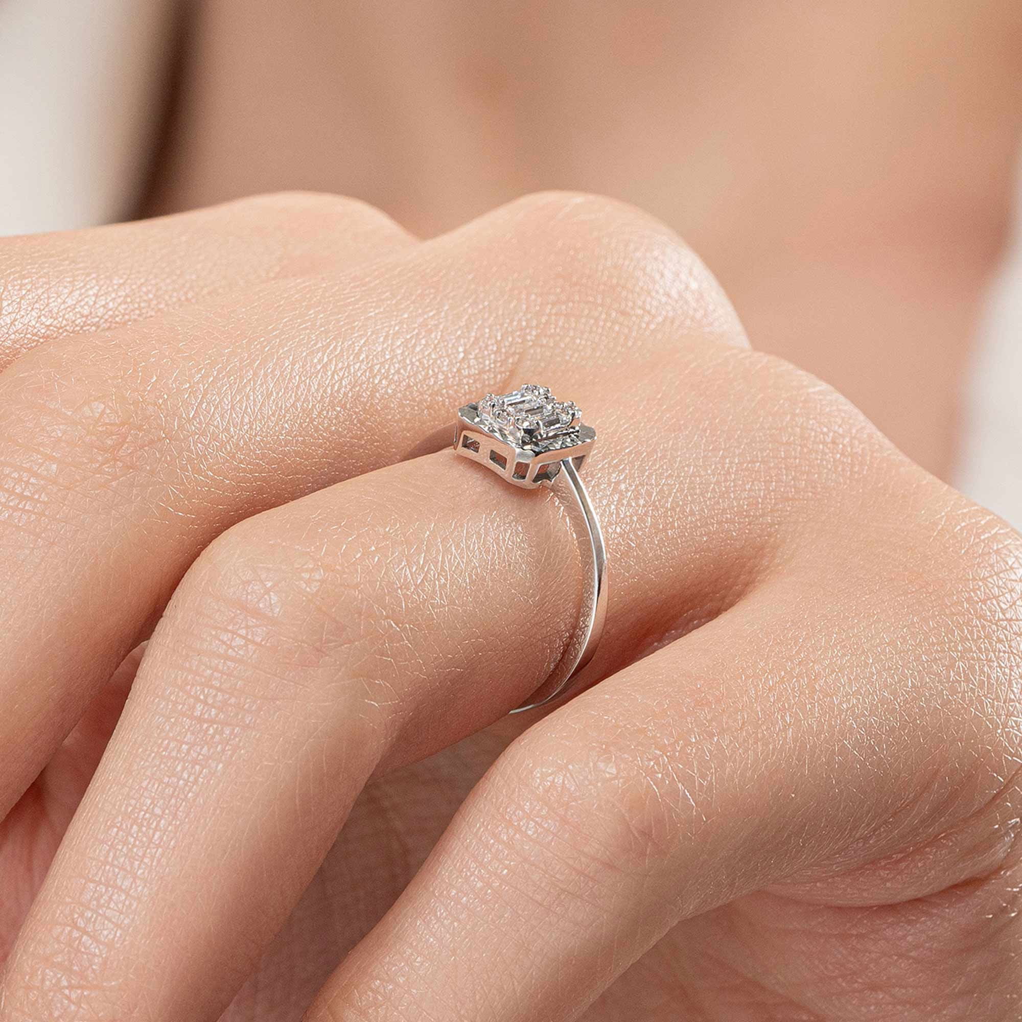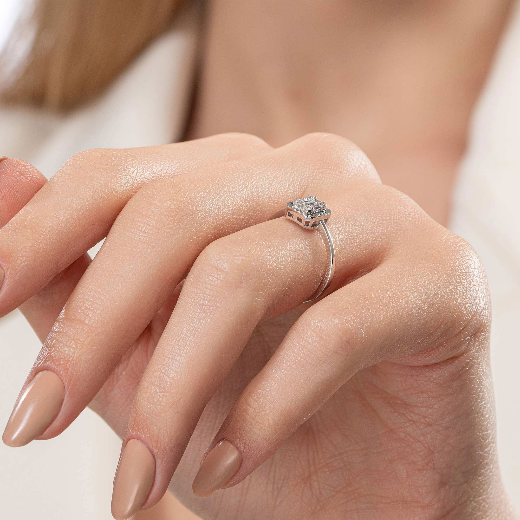 Üründe G renk SI berraklığında baget ve yuvarlak kesim pırlanta taşlar kullanılmaktadır. Parlaklığı ve netliğiyle dikkat çeken bu taşlar, zarif bir görünüm sunar. Altın ağırlığı, seçilen yüzük ölçüsüne göre farklılık gösterebilir.