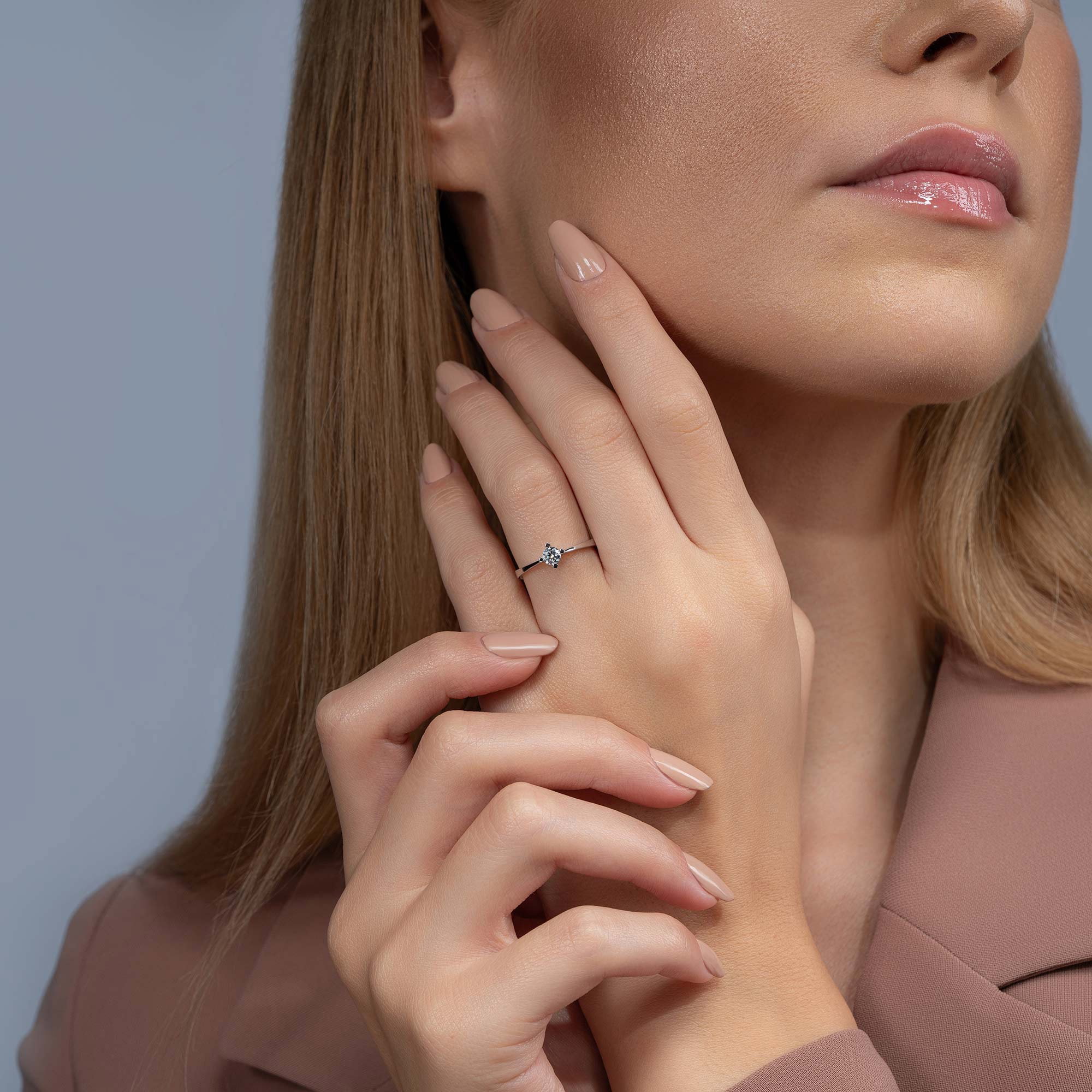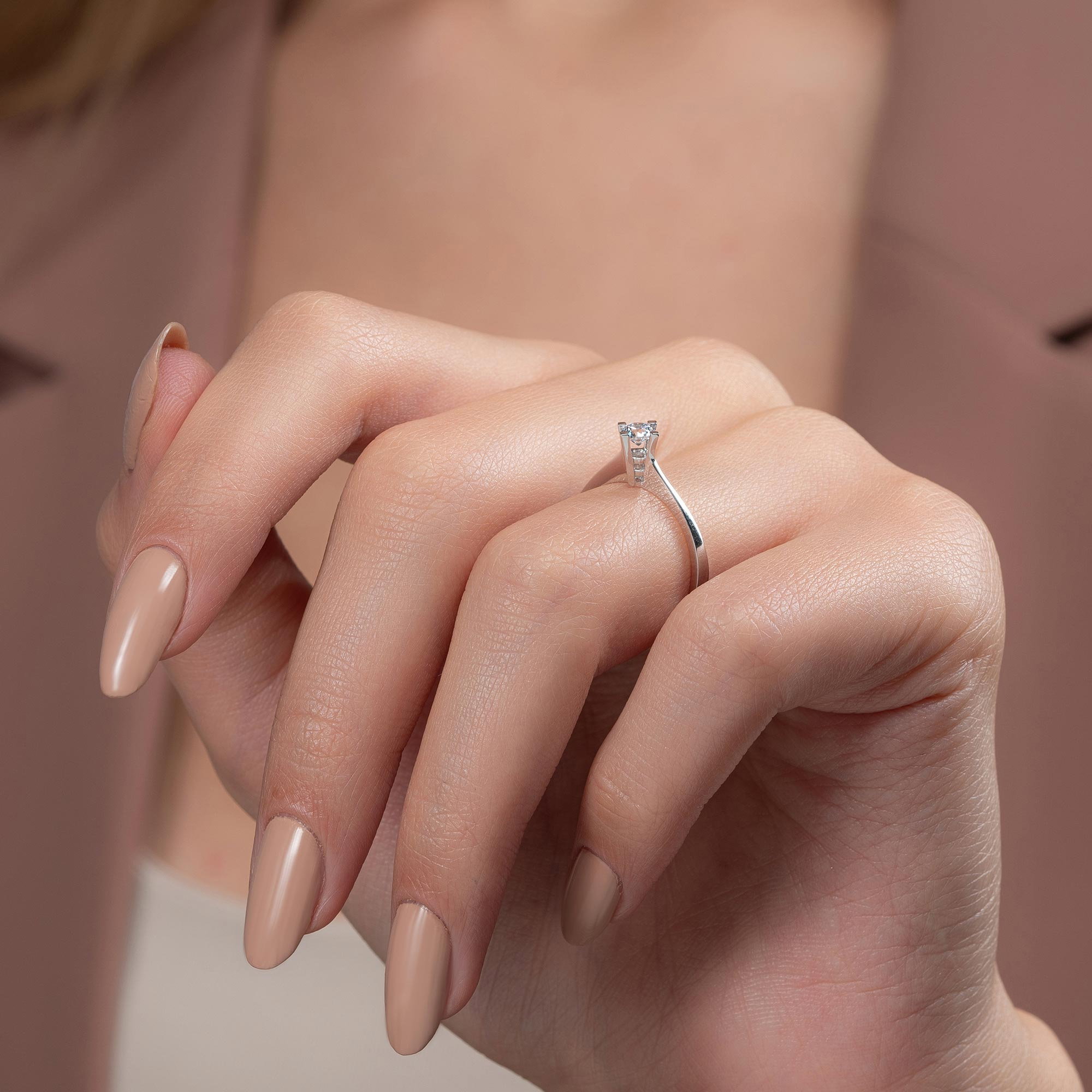 Üründe G renk SI berraklığında yuvarlak kesim pırlanta taşlar kullanılmaktadır. Parlaklığı ve netliğiyle dikkat çeken bu taşlar, zarif bir görünüm sunar. Altın ağırlığı, seçilen yüzük ölçüsüne göre farklılık gösterebilir.