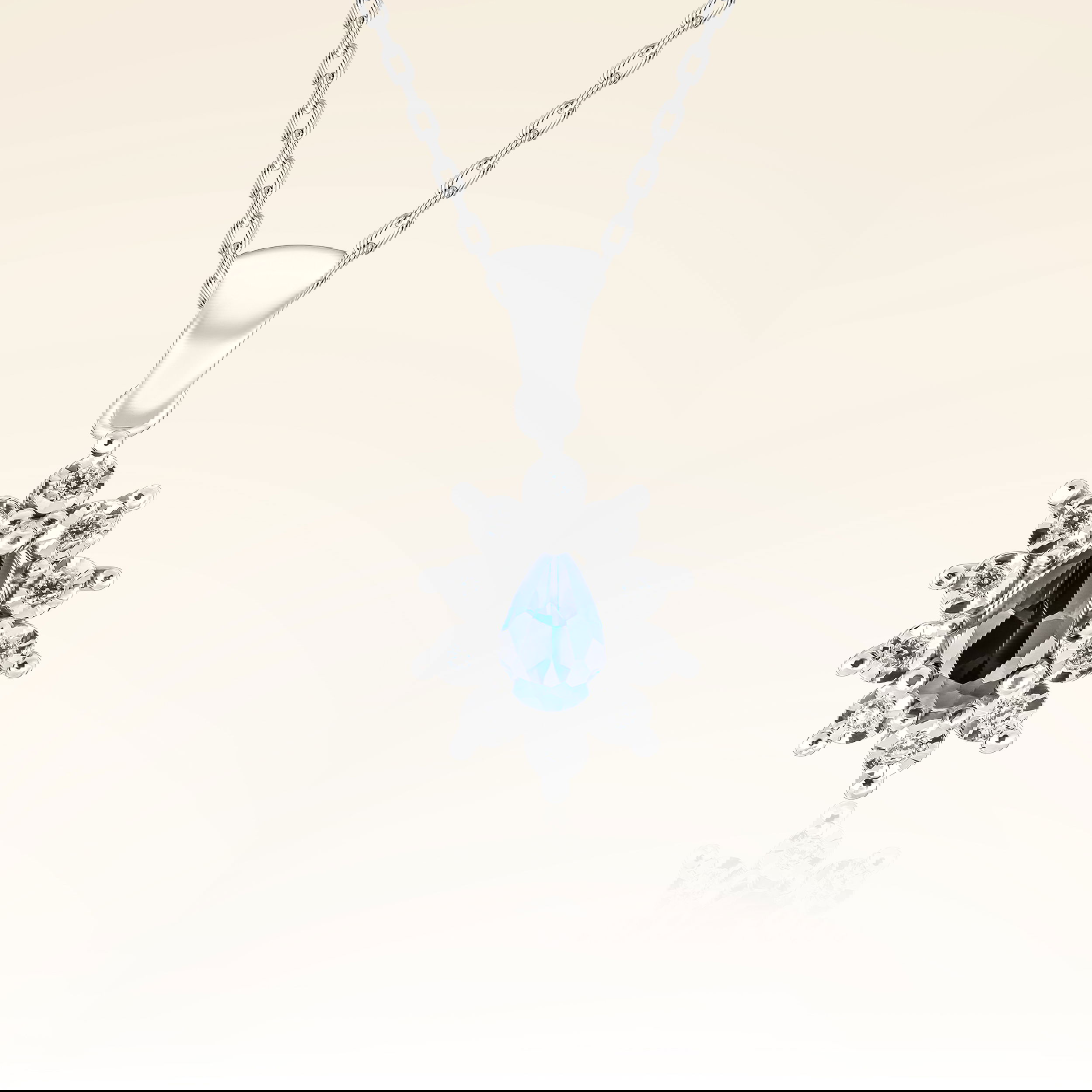 Üründe G renk SI berraklığında dala ve yuvarlak kesim safir ve pırlanta taşlar kullanılmaktadır. Parlaklığı ve netliğiyle dikkat çeken bu taşlar, zarif bir görünüm sunar. Pırlanta kolye, 42,5 cm standart zincir uzunluğu ile üretilmiştir.