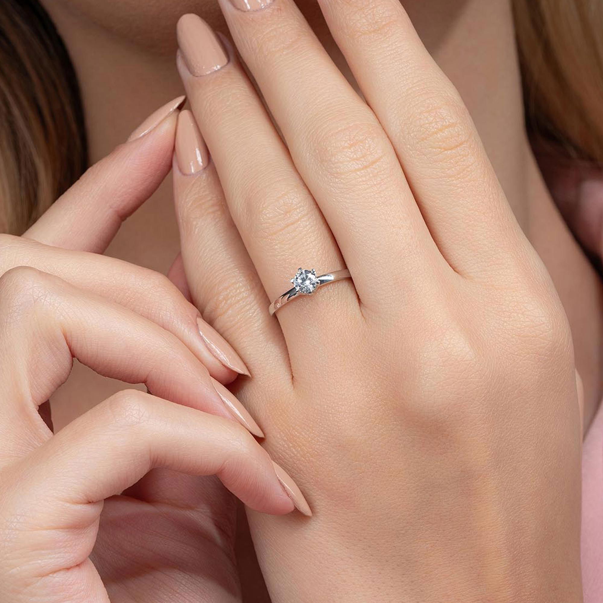 Üründe D renk SI2 berraklığında yuvarlak kesim pırlanta taşlar kullanılmaktadır. Parlaklığı ve netliğiyle dikkat çeken bu taşlar, zarif bir görünüm sunar. Altın ağırlığı, seçilen yüzük ölçüsüne göre farklılık gösterebilir.