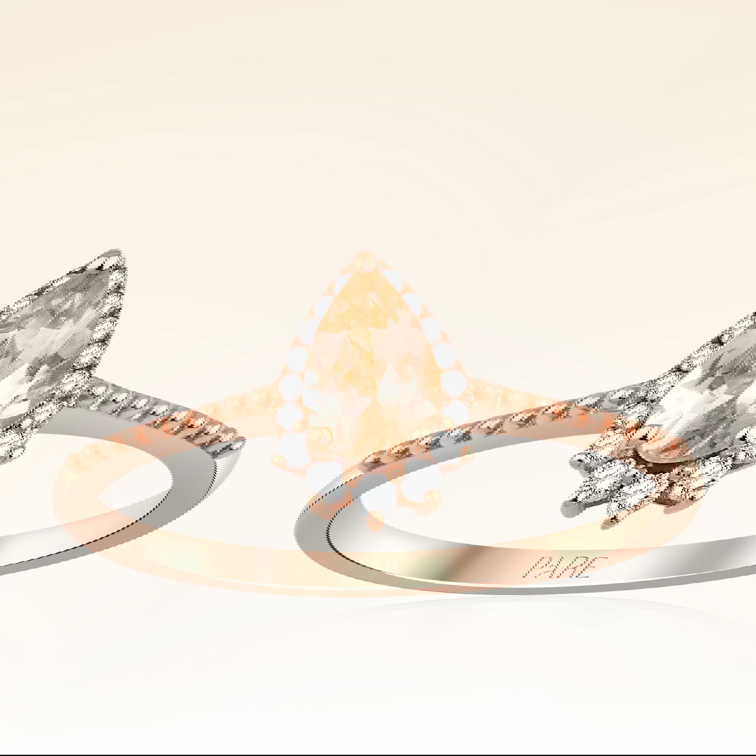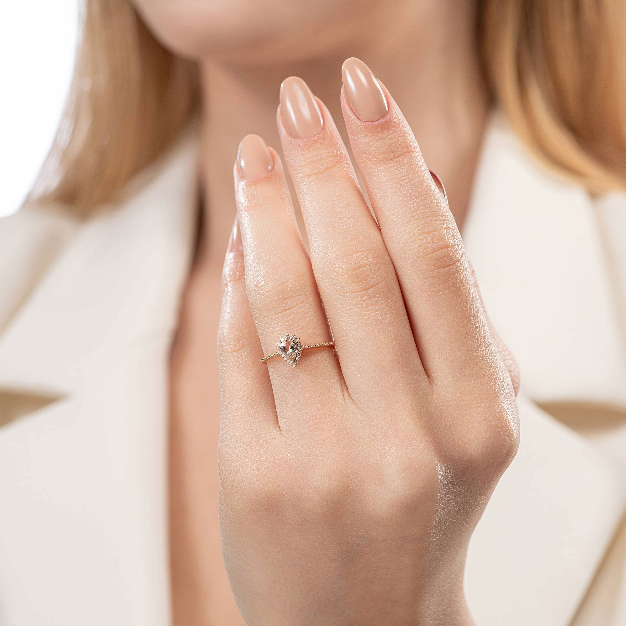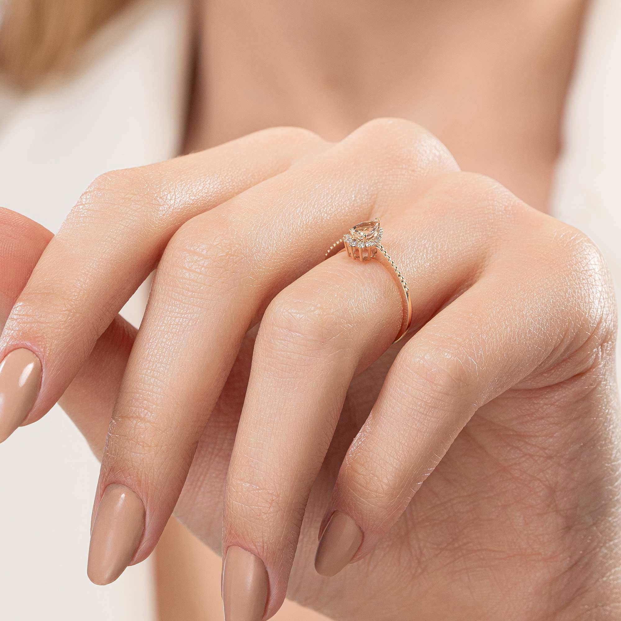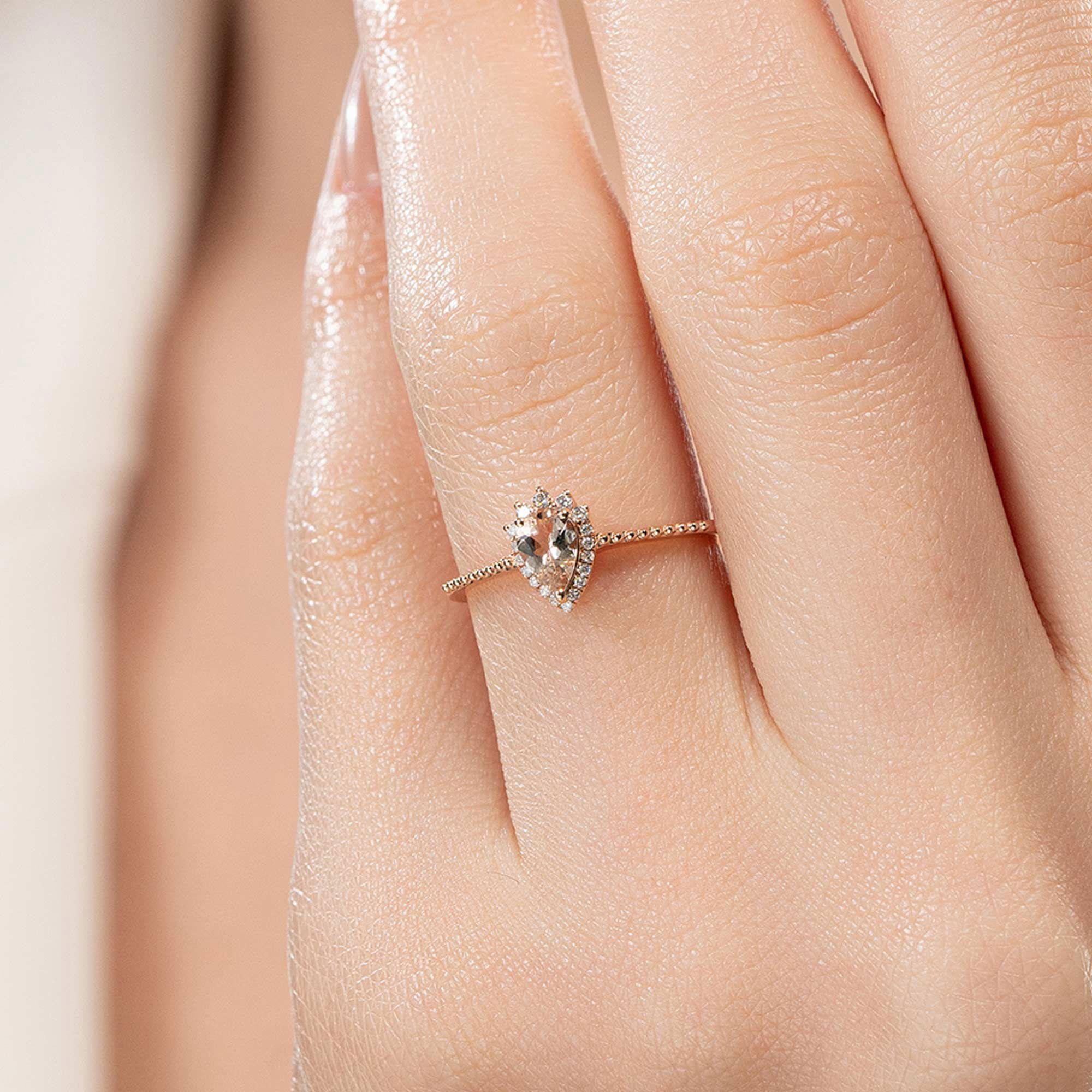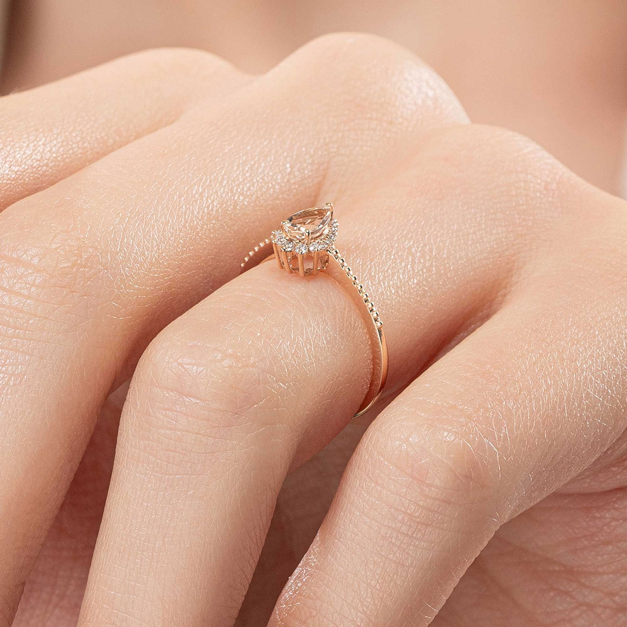 Gelince Haber VerÜründe G renk SI berraklığında damla ve yuvarlak kesim morganit ve pırlanta taşlar kullanılmaktadır. Parlaklığı ve netliğiyle dikkat çeken bu taşlar, zarif bir görünüm sunar. Altın ağırlığı, seçilen yüzük ölçüsüne göre farklılık gösterebilir.
