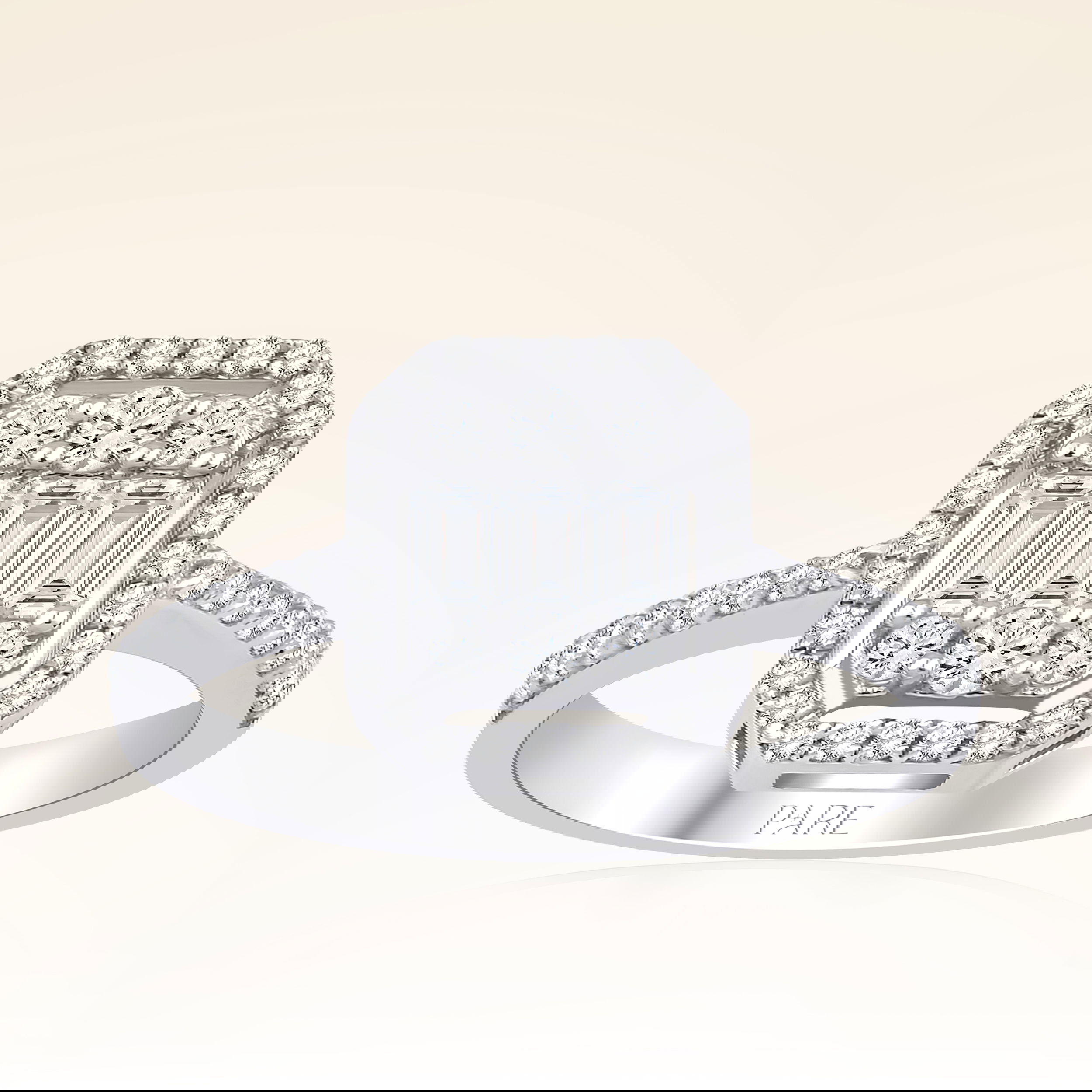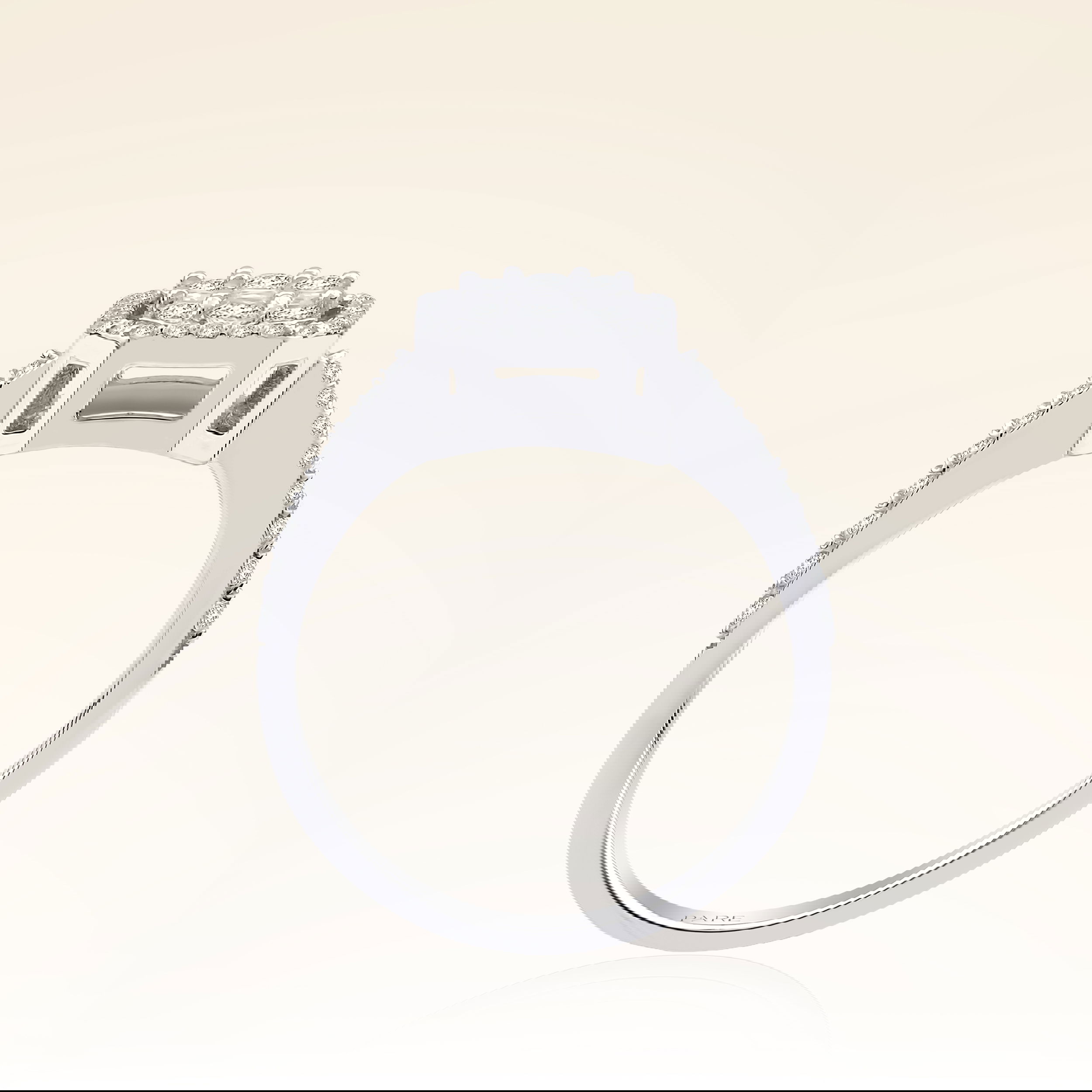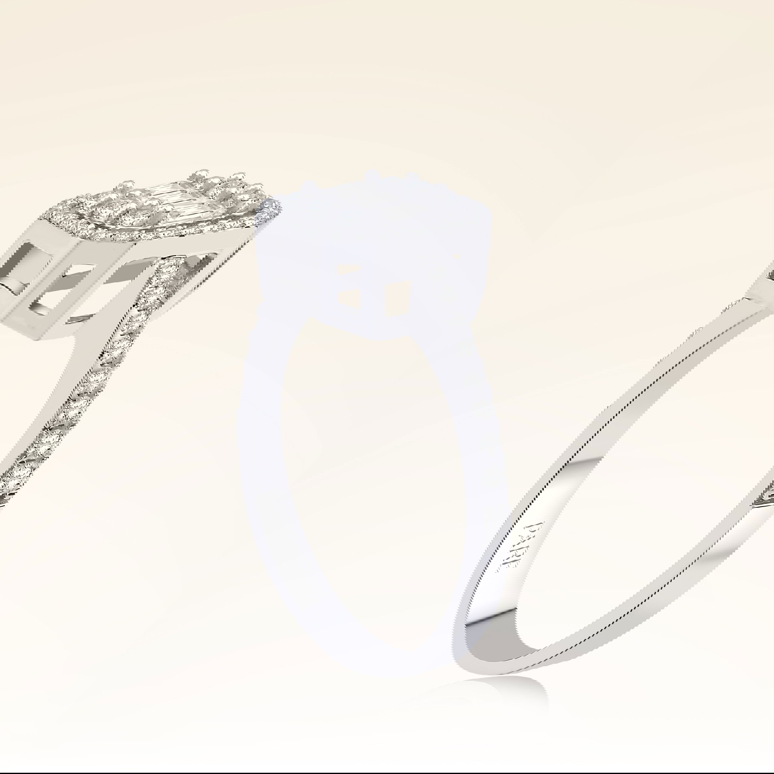 Üründe G renk SI berraklığında baget ve yuvarlak kesim pırlanta taşlar kullanılmaktadır. Parlaklığı ve netliğiyle dikkat çeken bu taşlar, zarif bir görünüm sunar. Altın ağırlığı, seçilen yüzük ölçüsüne göre farklılık gösterebilir.