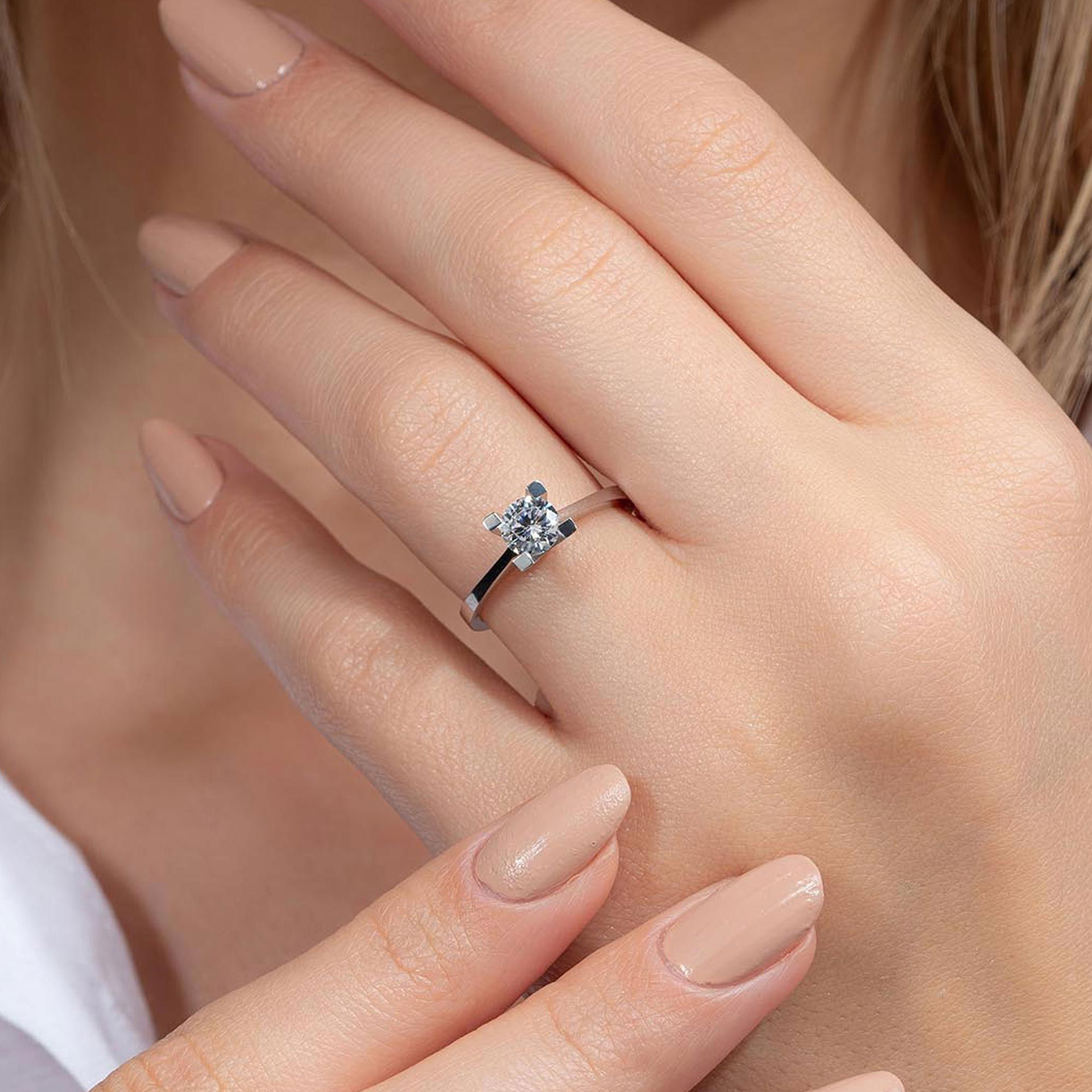 Üründe D renk SI2 berraklığında yuvarlak kesim pırlanta taşlar kullanılmaktadır. Parlaklığı ve netliğiyle dikkat çeken bu taşlar, zarif bir görünüm sunar. Altın ağırlığı, seçilen yüzük ölçüsüne göre farklılık gösterebilir.