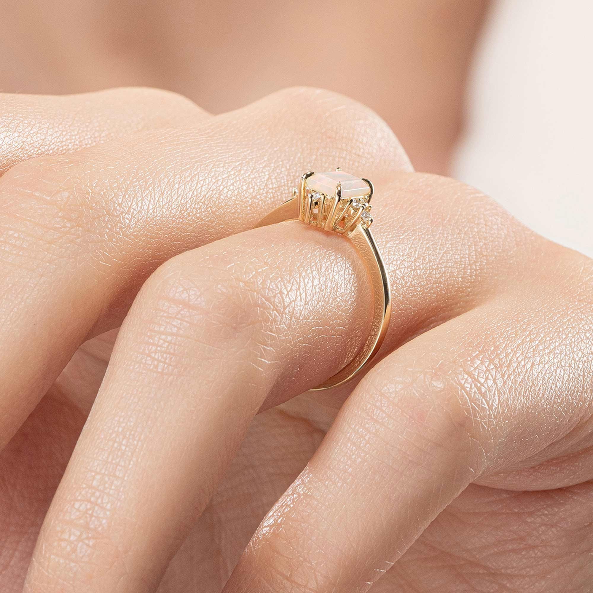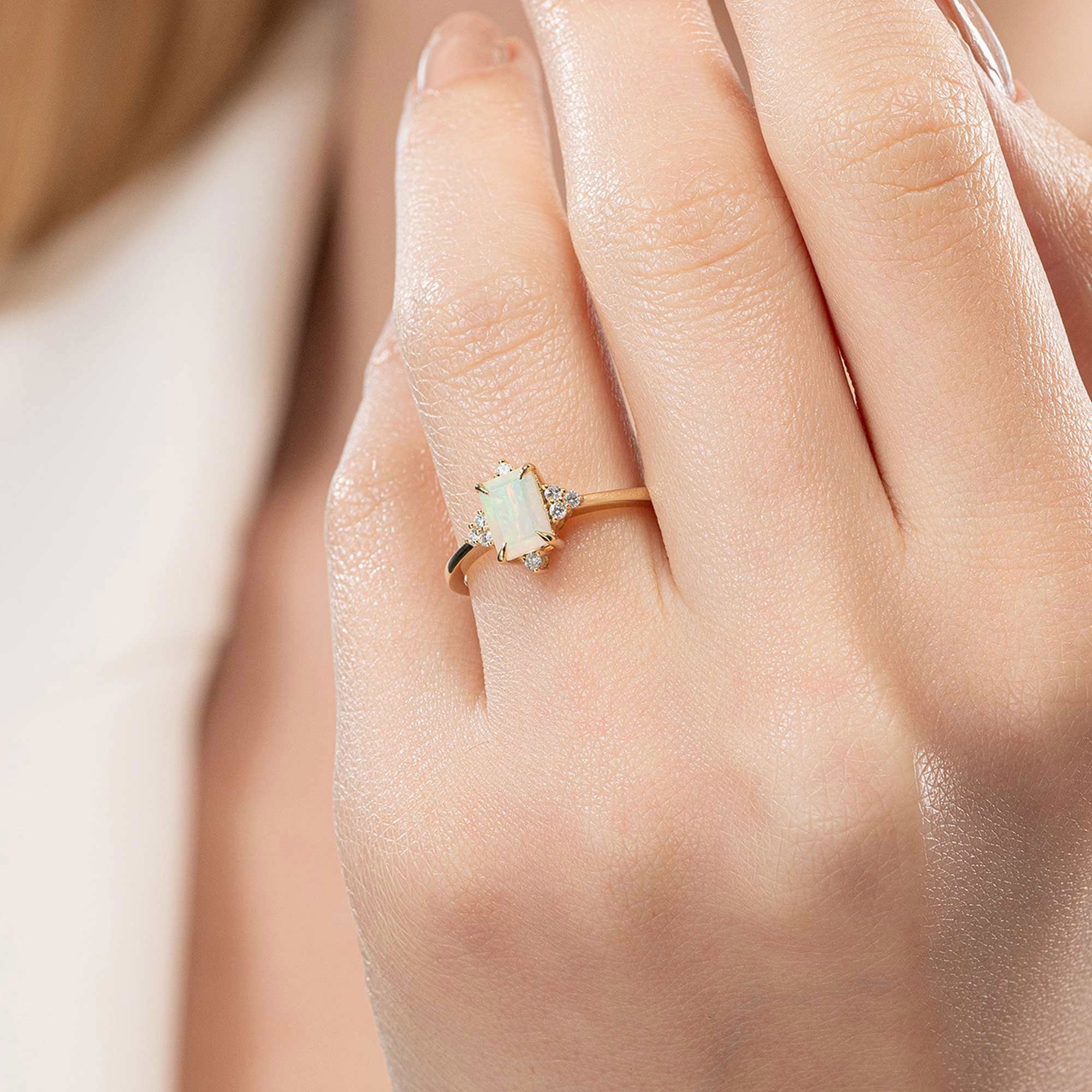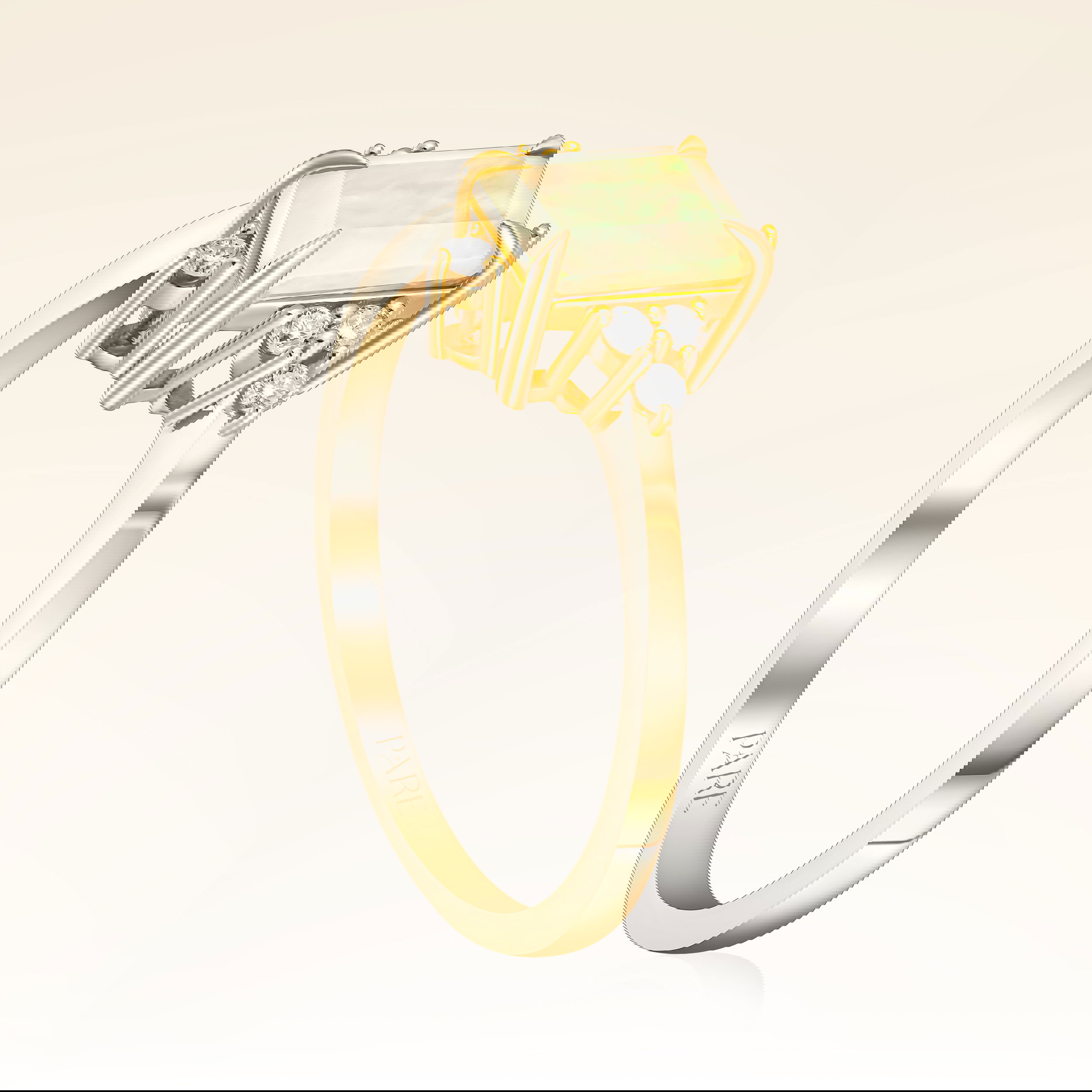 Gelince Haber VerÜründe G renk SI berraklığında emerald ve yuvarlak kesim opal ve pırlanta taşlar kullanılmaktadır. Parlaklığı ve netliğiyle dikkat çeken bu taşlar, zarif bir görünüm sunar. Altın ağırlığı, seçilen yüzük ölçüsüne göre farklılık gösterebilir.