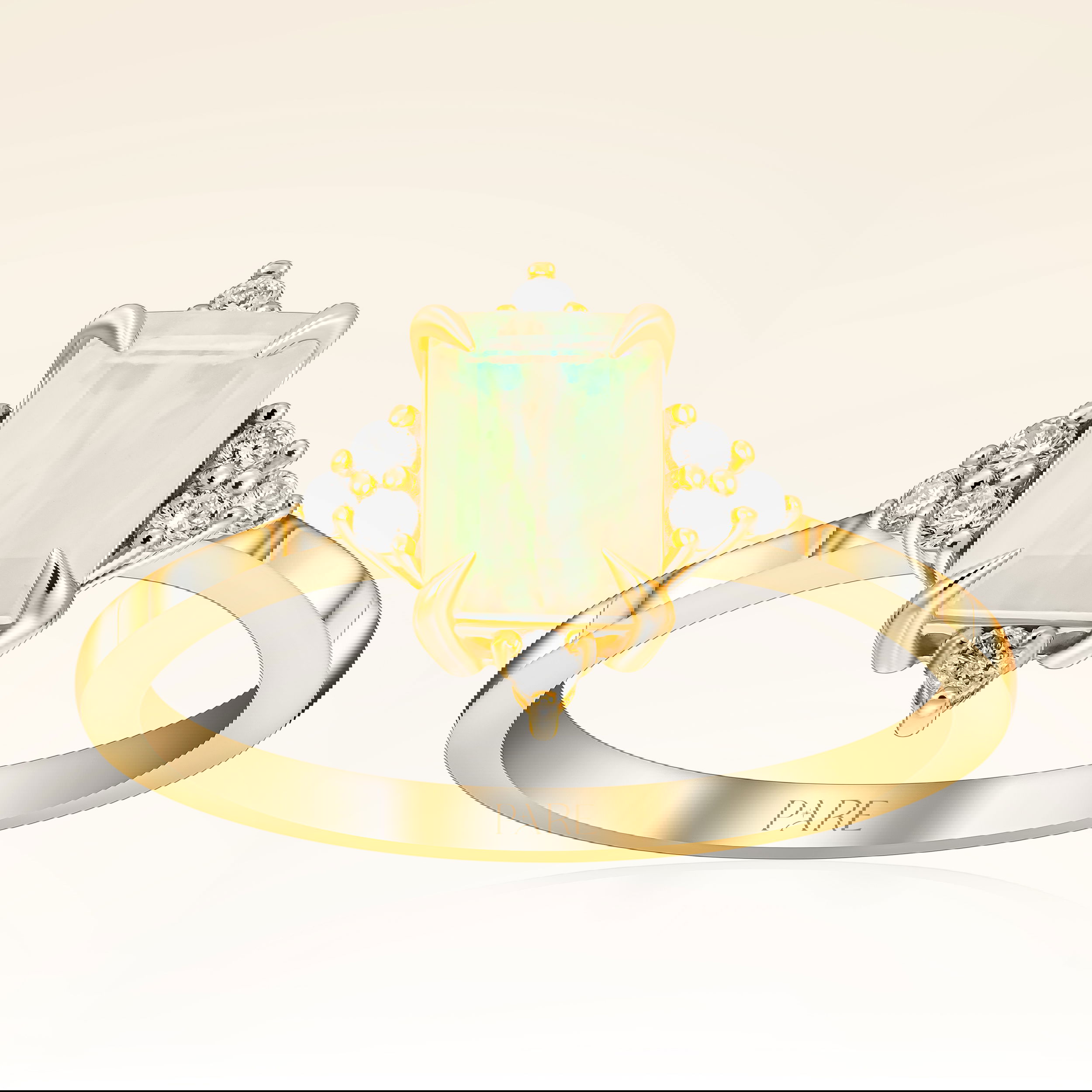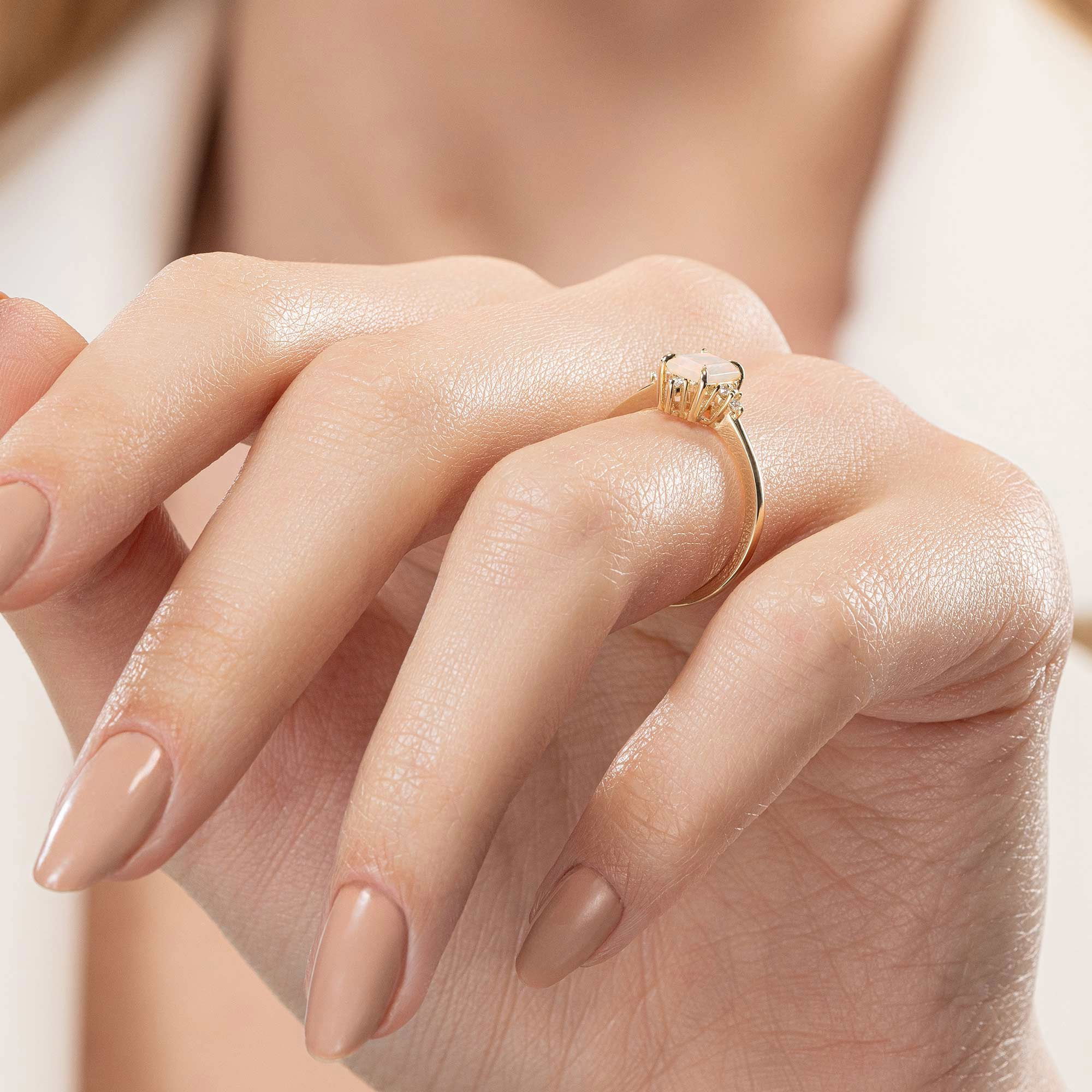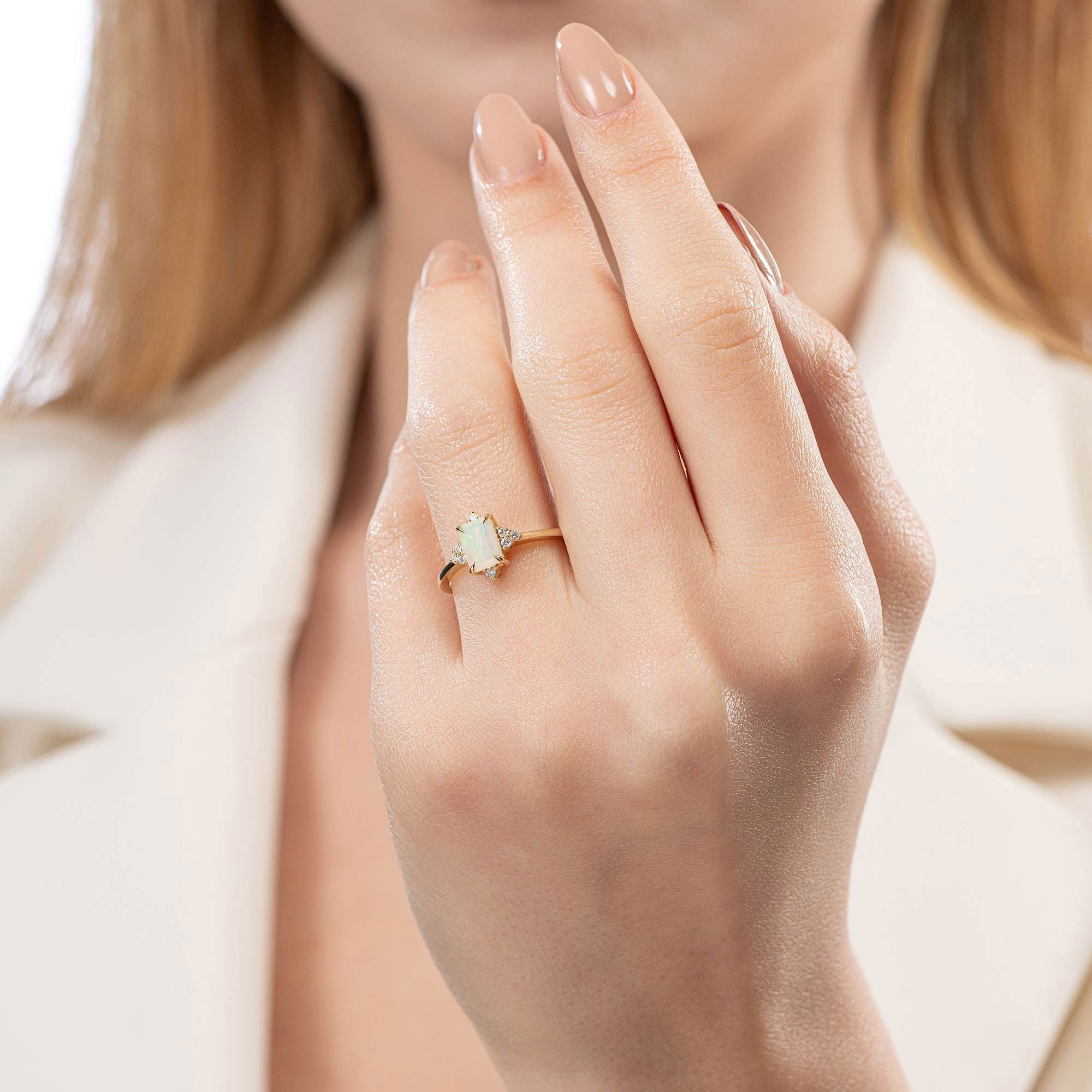 Gelince Haber VerÜründe G renk SI berraklığında emerald ve yuvarlak kesim opal ve pırlanta taşlar kullanılmaktadır. Parlaklığı ve netliğiyle dikkat çeken bu taşlar, zarif bir görünüm sunar. Altın ağırlığı, seçilen yüzük ölçüsüne göre farklılık gösterebilir.