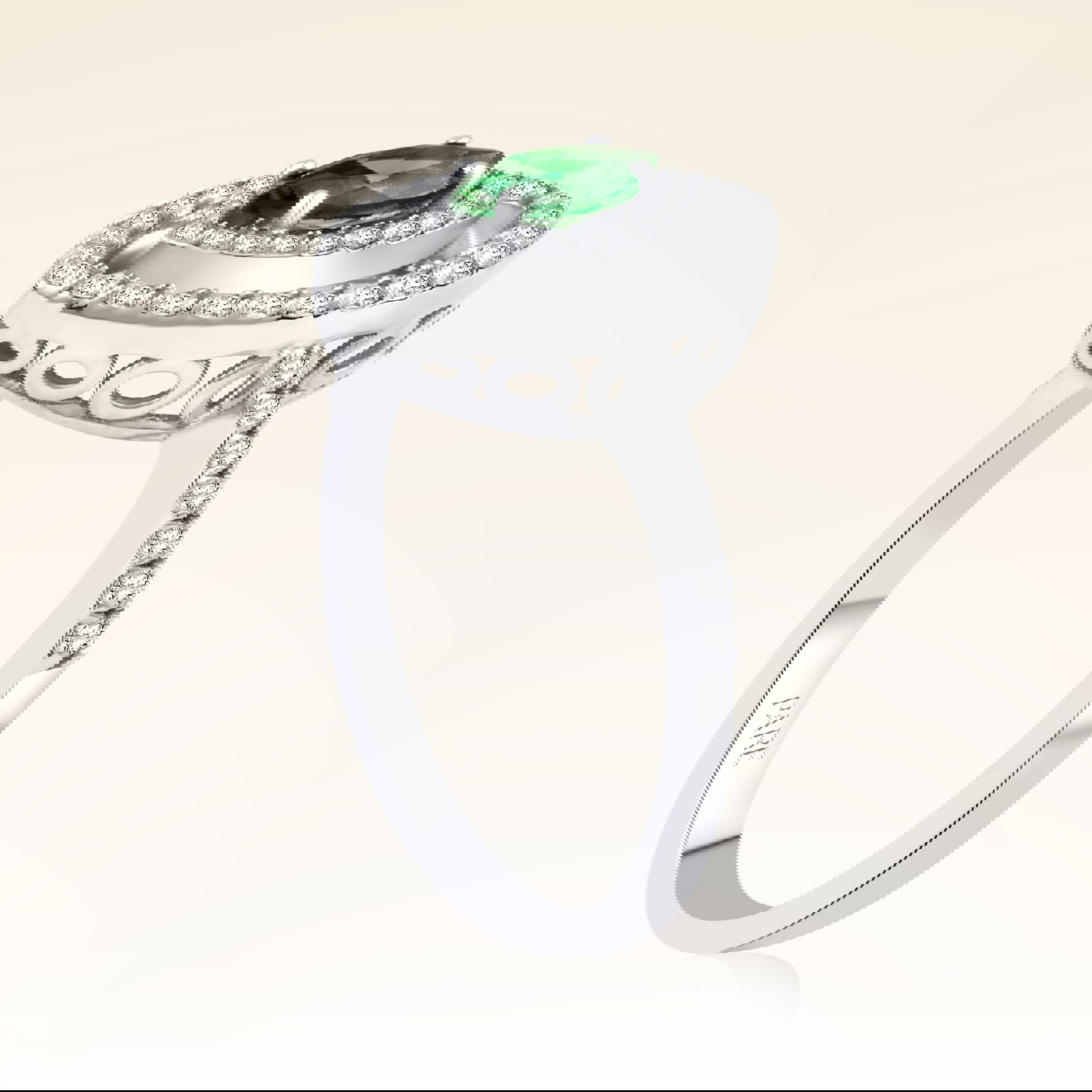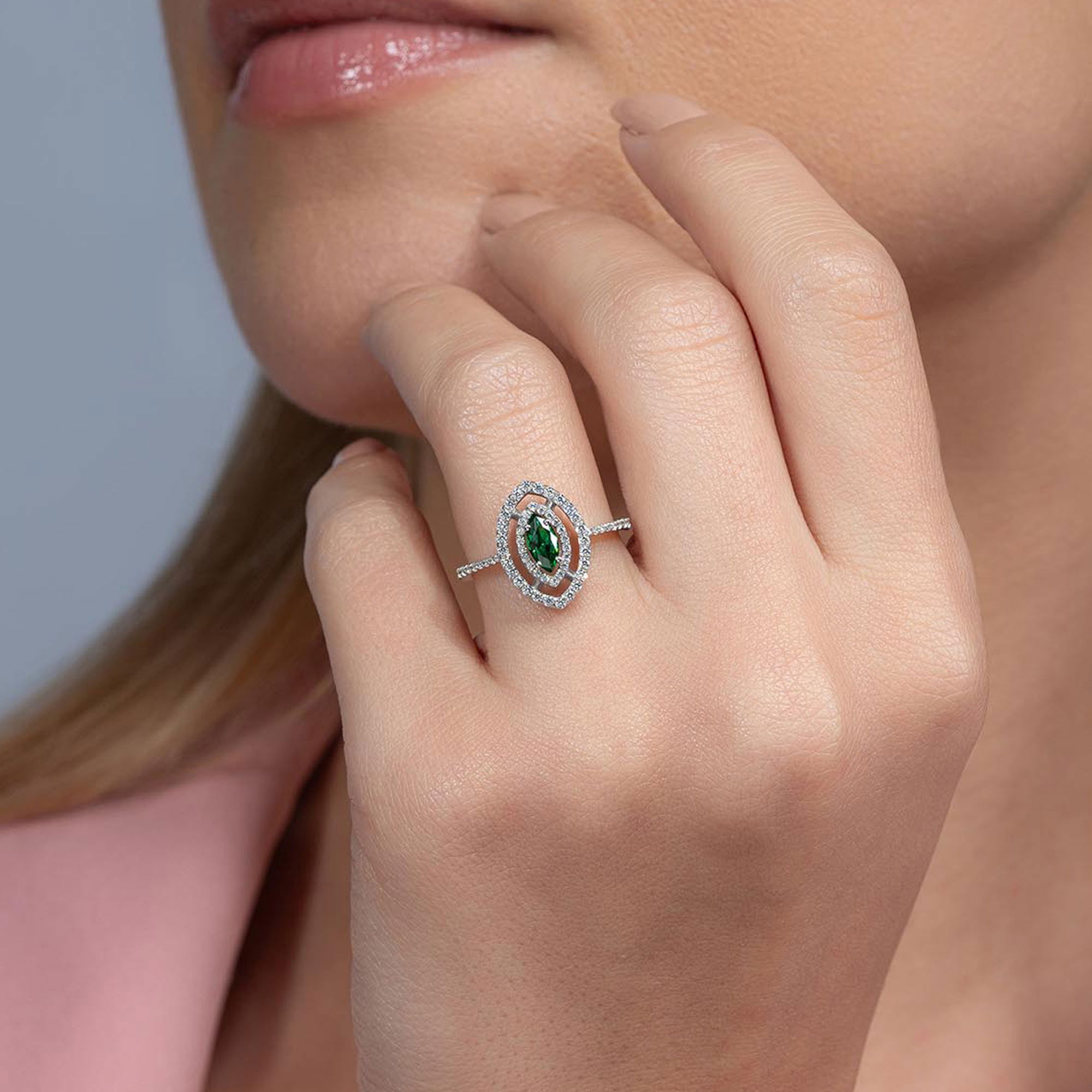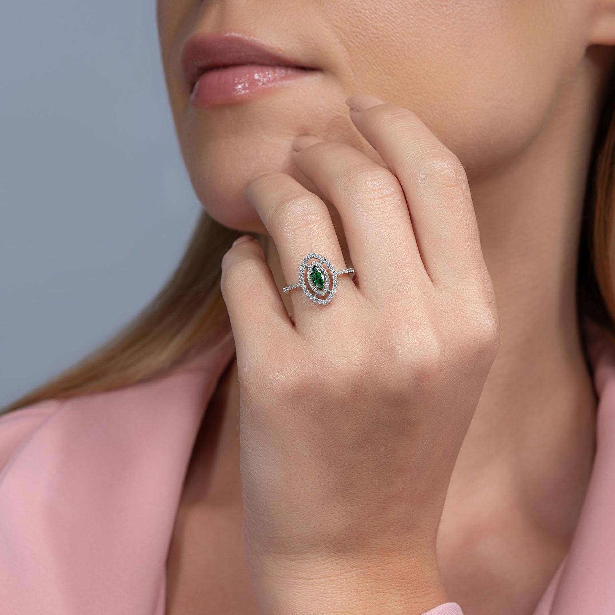 Gelince Haber VerÜründe G renk SI berraklığında markiz ve yuvarlak kesim zümrüt ve pırlanta taşlar kullanılmaktadır. Parlaklığı ve netliğiyle dikkat çeken bu taşlar, zarif bir görünüm sunar. Altın ağırlığı, seçilen yüzük ölçüsüne göre farklılık gösterebilir.