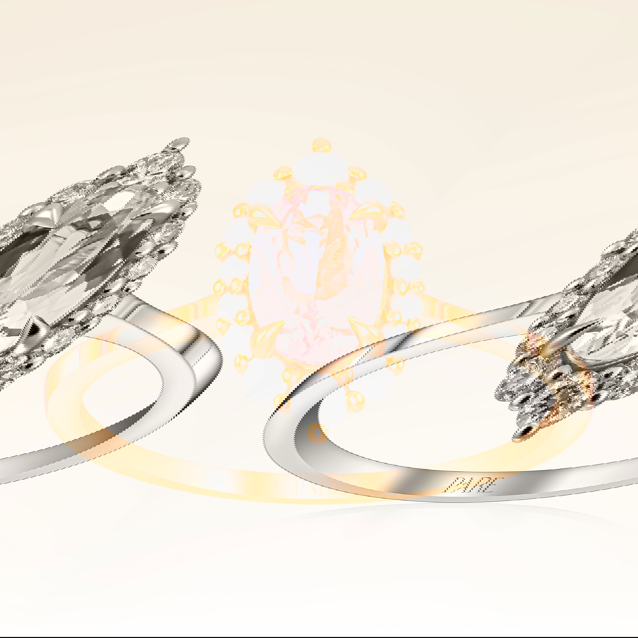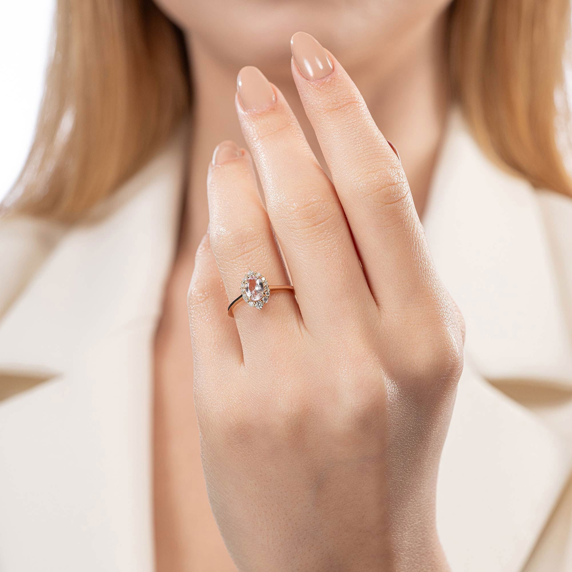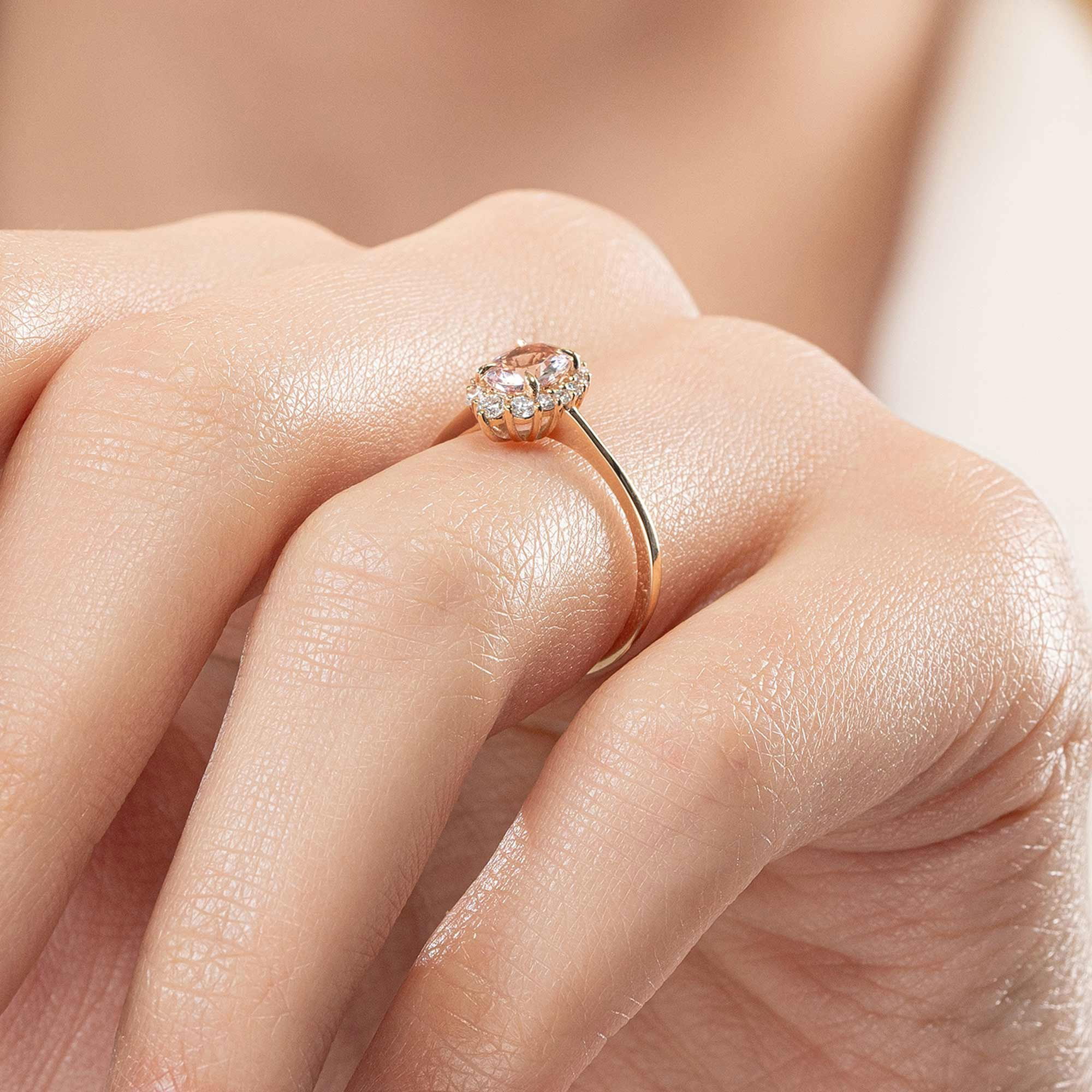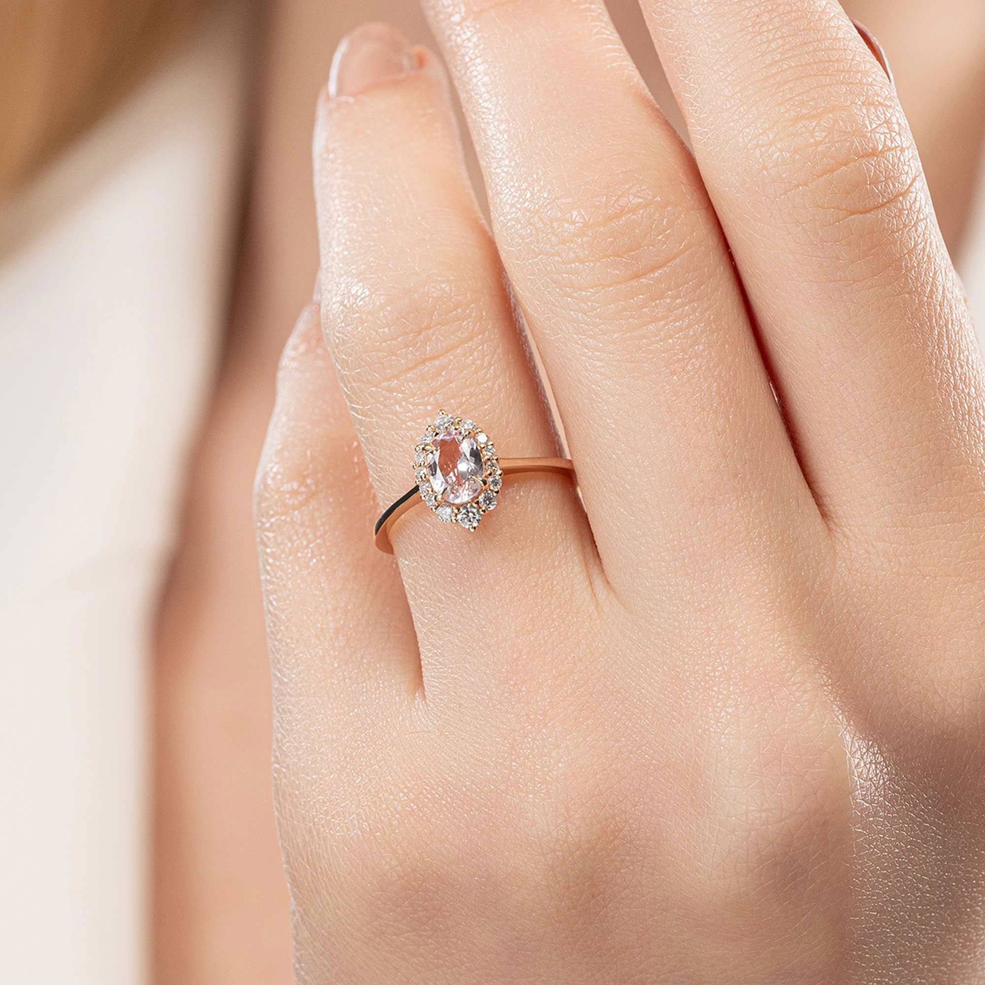 Gelince Haber VerÜründe G renk SI berraklığında oval ve yuvarlak kesim morganit ve pırlanta taşlar kullanılmaktadır. Parlaklığı ve netliğiyle dikkat çeken bu taşlar, zarif bir görünüm sunar. Altın ağırlığı, seçilen yüzük ölçüsüne göre farklılık gösterebilir.