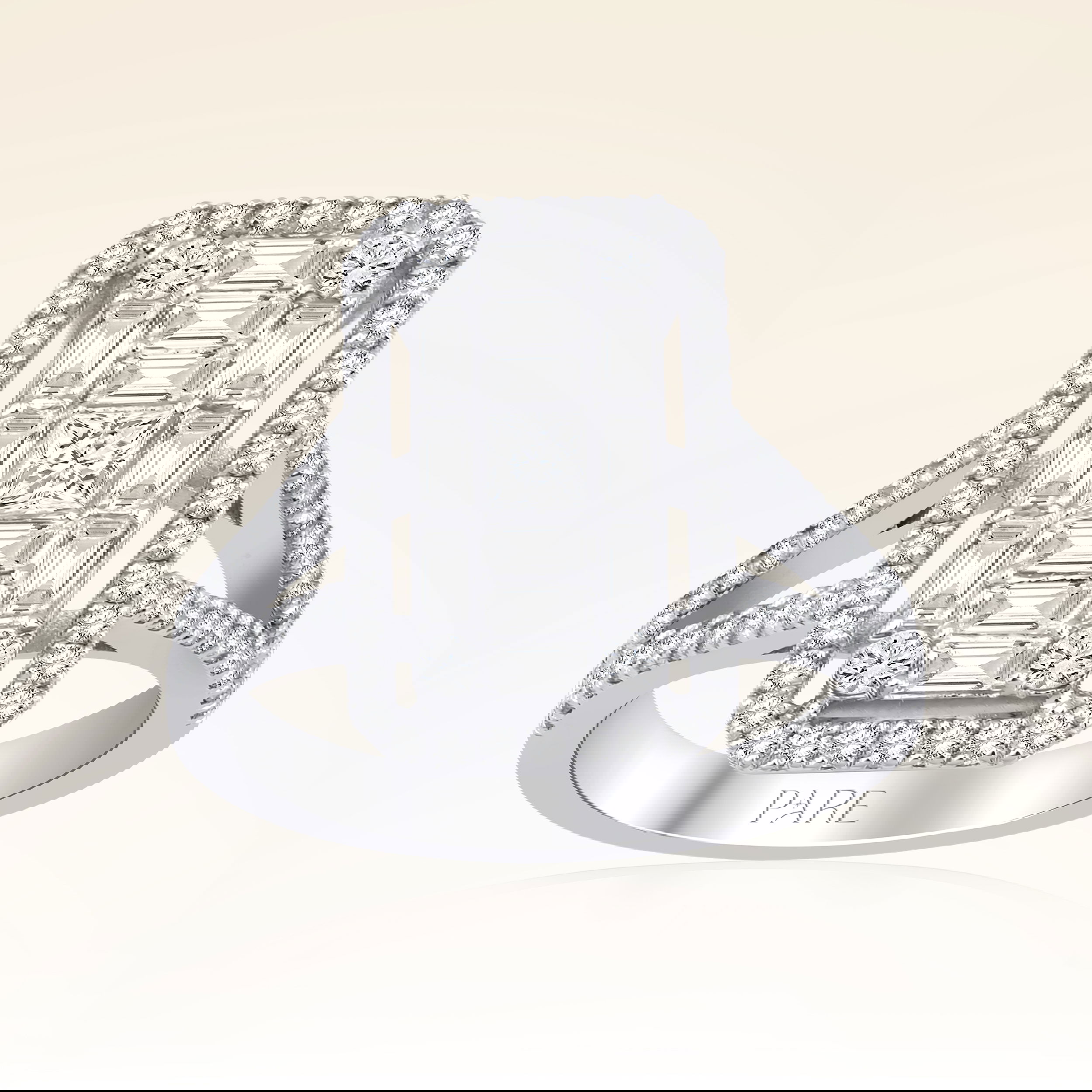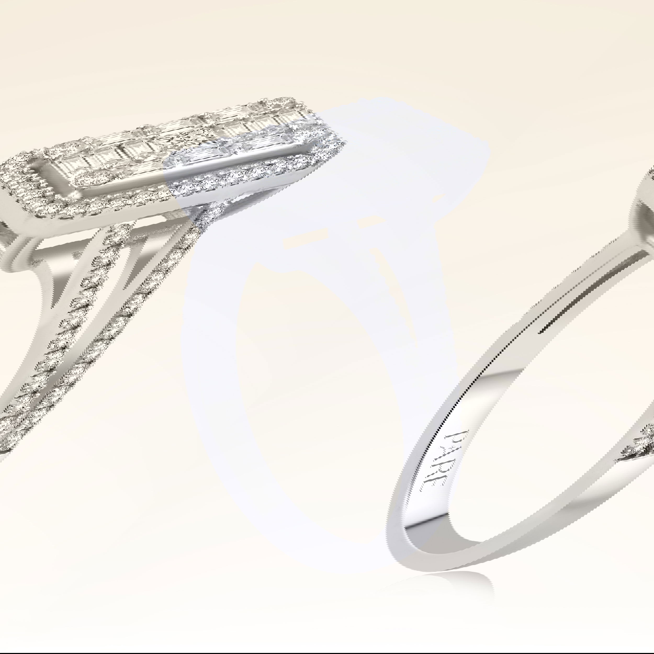 Üründe G renk SI berraklığında baget, prenses ve yuvarlak kesim pırlanta taşlar kullanılmaktadır. Parlaklığı ve netliğiyle dikkat çeken bu taşlar, zarif bir görünüm sunar. Altın ağırlığı, seçilen yüzük ölçüsüne göre farklılık gösterebilir.