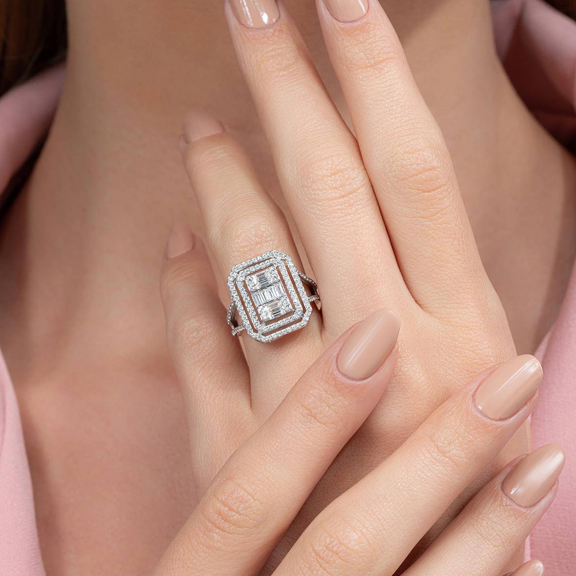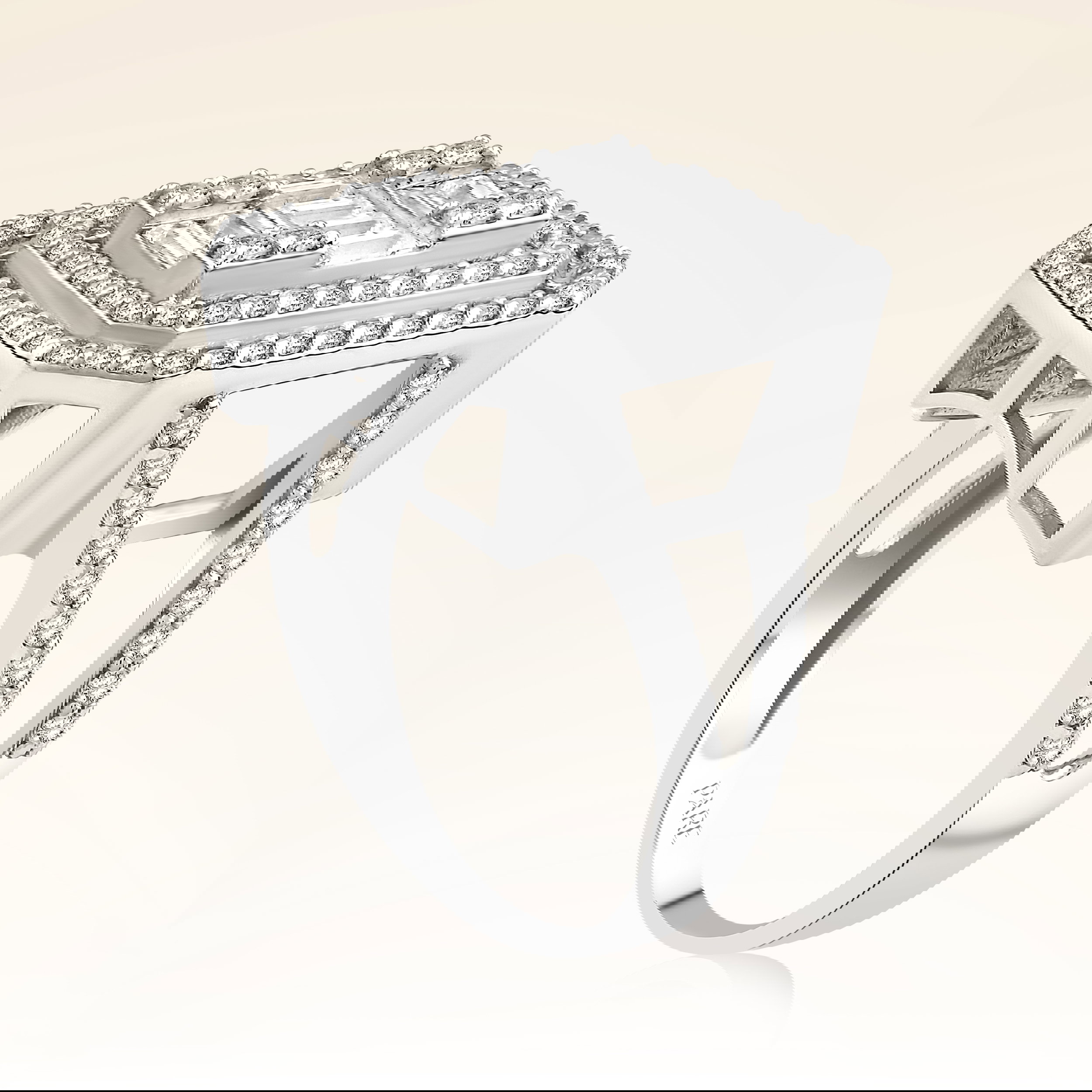 Üründe G renk SI berraklığında baget ve yuvarlak kesim pırlanta taşlar kullanılmaktadır. Parlaklığı ve netliğiyle dikkat çeken bu taşlar, zarif bir görünüm sunar. Altın ağırlığı, seçilen yüzük ölçüsüne göre farklılık gösterebilir.