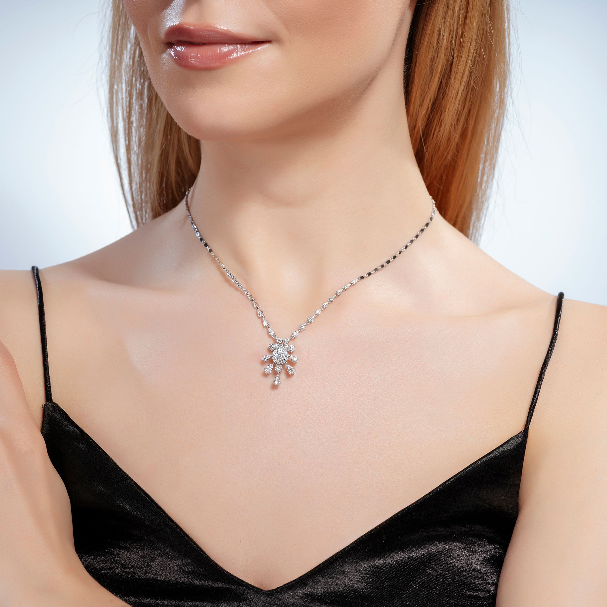 Üründe G renk SI berraklığında yuvarlak kesim pırlanta taşlar kullanılmaktadır. Parlaklığı ve netliğiyle dikkat çeken bu taşlar, zarif bir görünüm sunar. Pırlanta kolye, 42,5 cm standart zincir uzunluğu ile üretilmiştir.