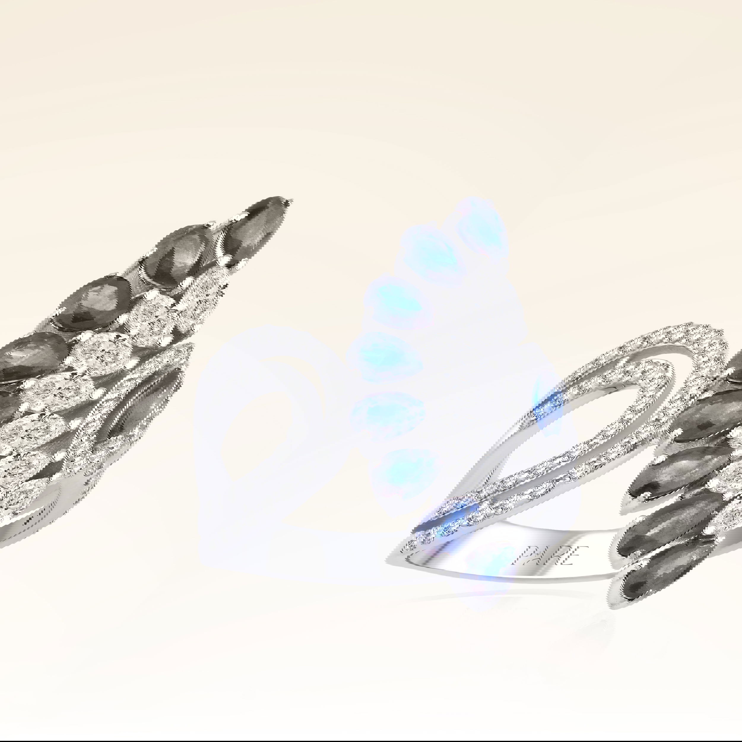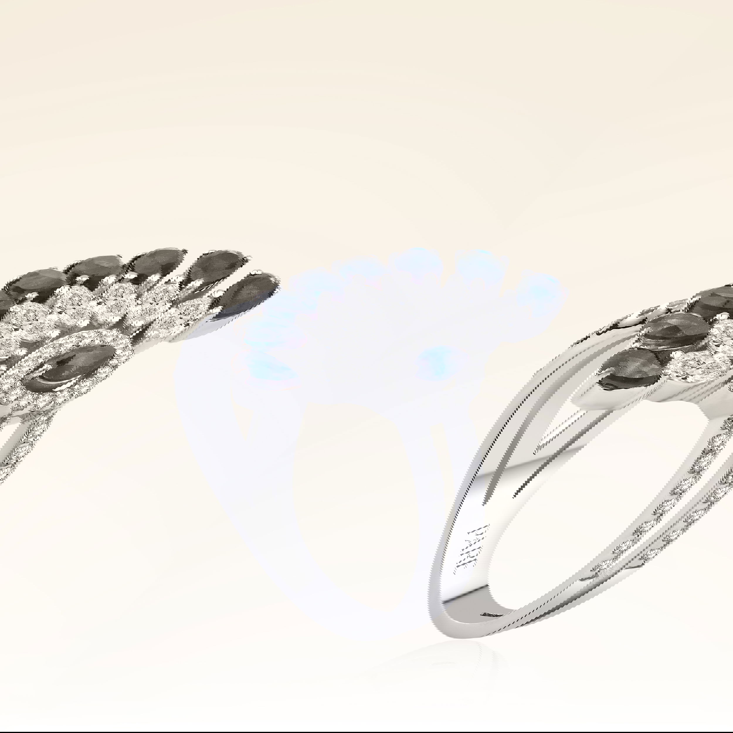 Üründe G renk SI berraklığında markiz, damla ve yuvarlak kesim safir ve pırlanta taşlar kullanılmaktadır. Parlaklığı ve netliğiyle dikkat çeken bu taşlar, zarif bir görünüm sunar. Altın ağırlığı, seçilen yüzük ölçüsüne göre farklılık gösterebilir.