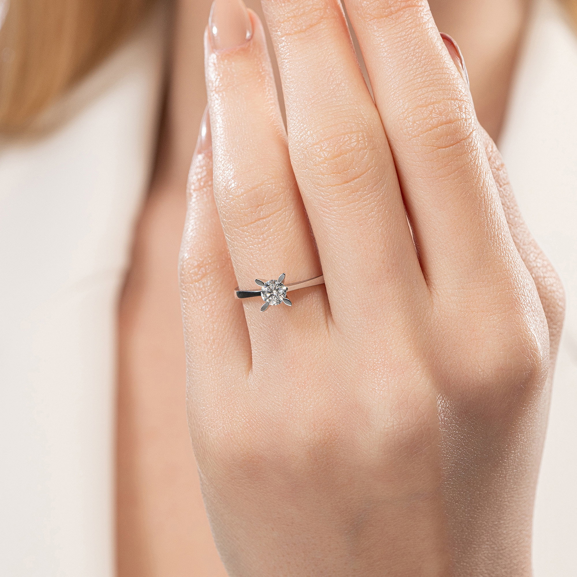 Üründe G renk SI2 berraklığında yuvarlak kesim pırlanta taşlar kullanılmaktadır. Parlaklığı ve netliğiyle dikkat çeken bu taşlar, zarif bir görünüm sunar. Altın ağırlığı, seçilen yüzük ölçüsüne göre farklılık gösterebilir.