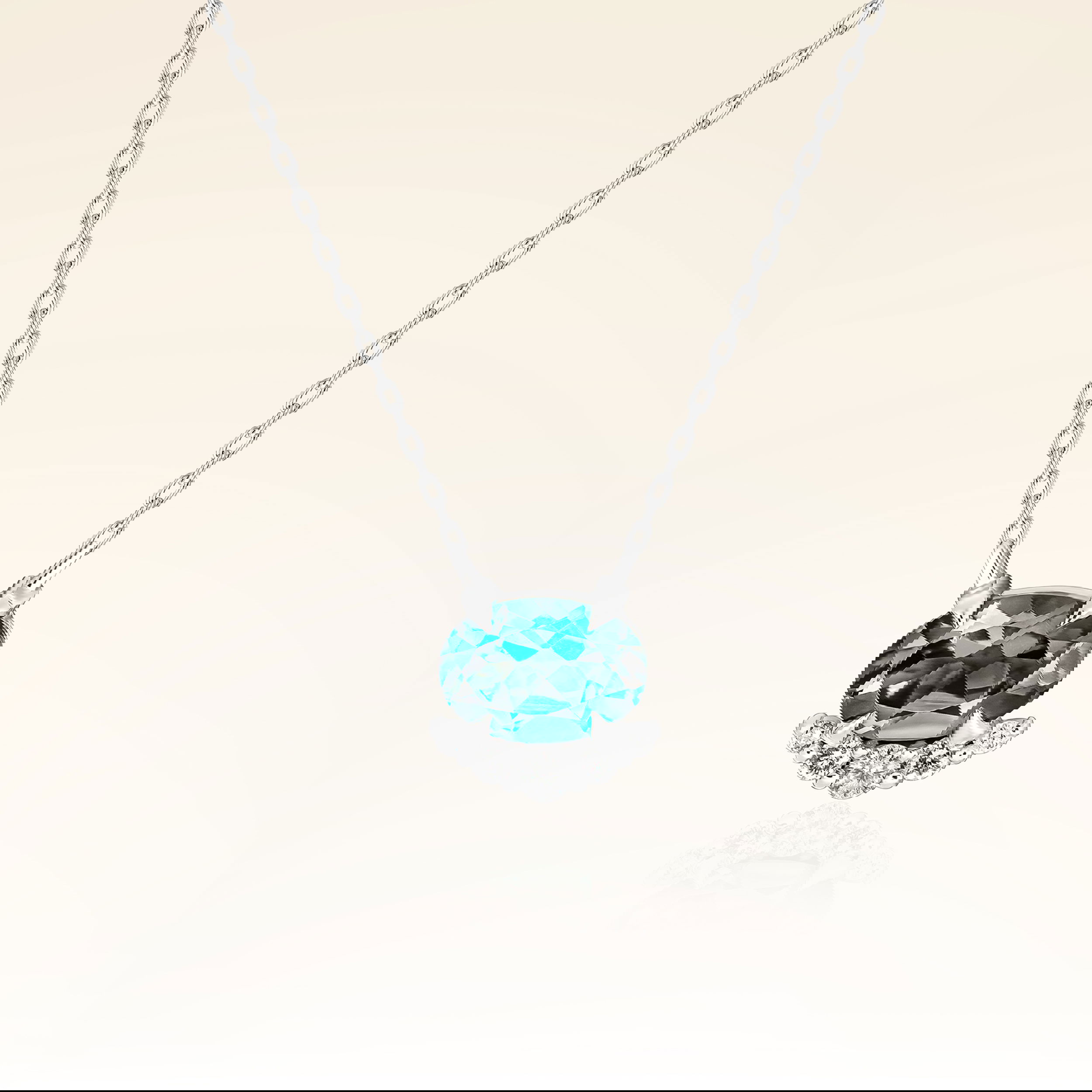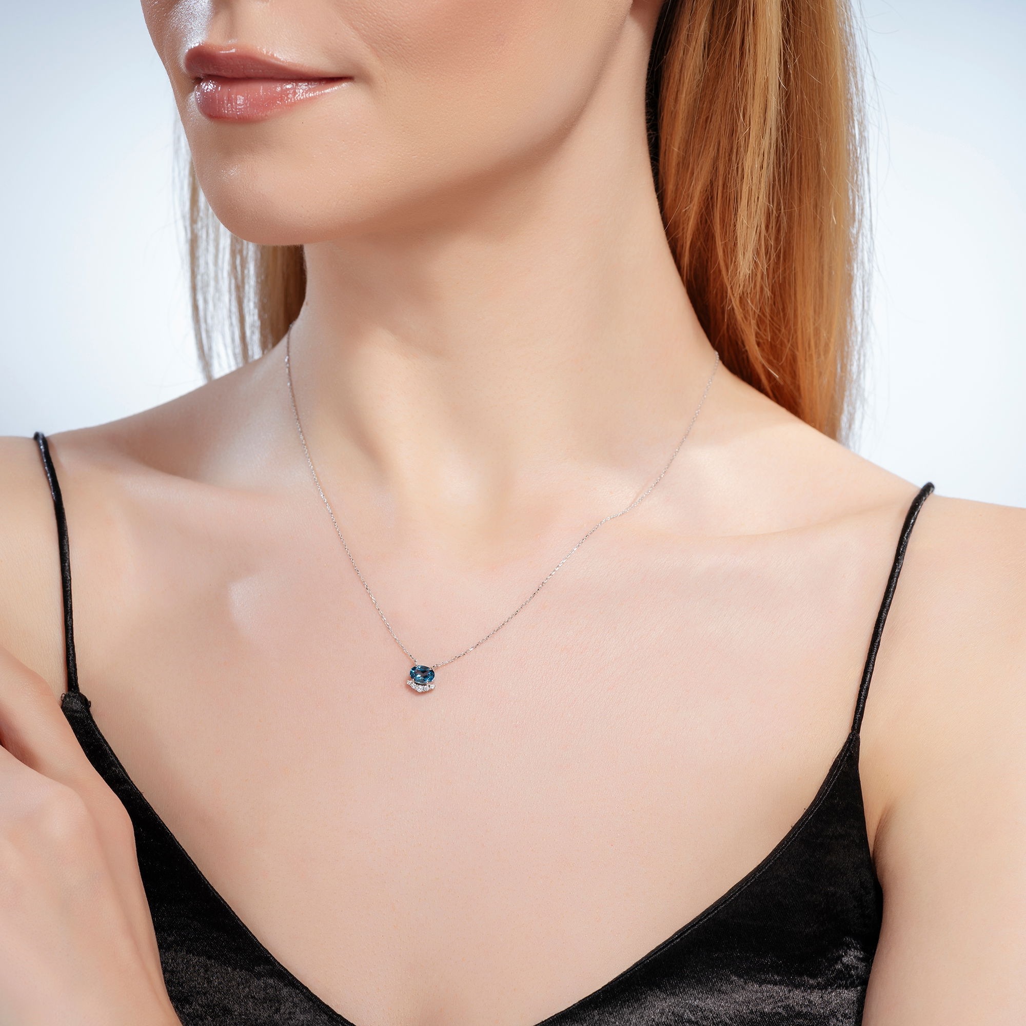 1,00 Karat Oval London Blue Topaz Pırlantalı Kolye - Yaklaşık 1,68gr. 14 Ayar Beyaz Altın